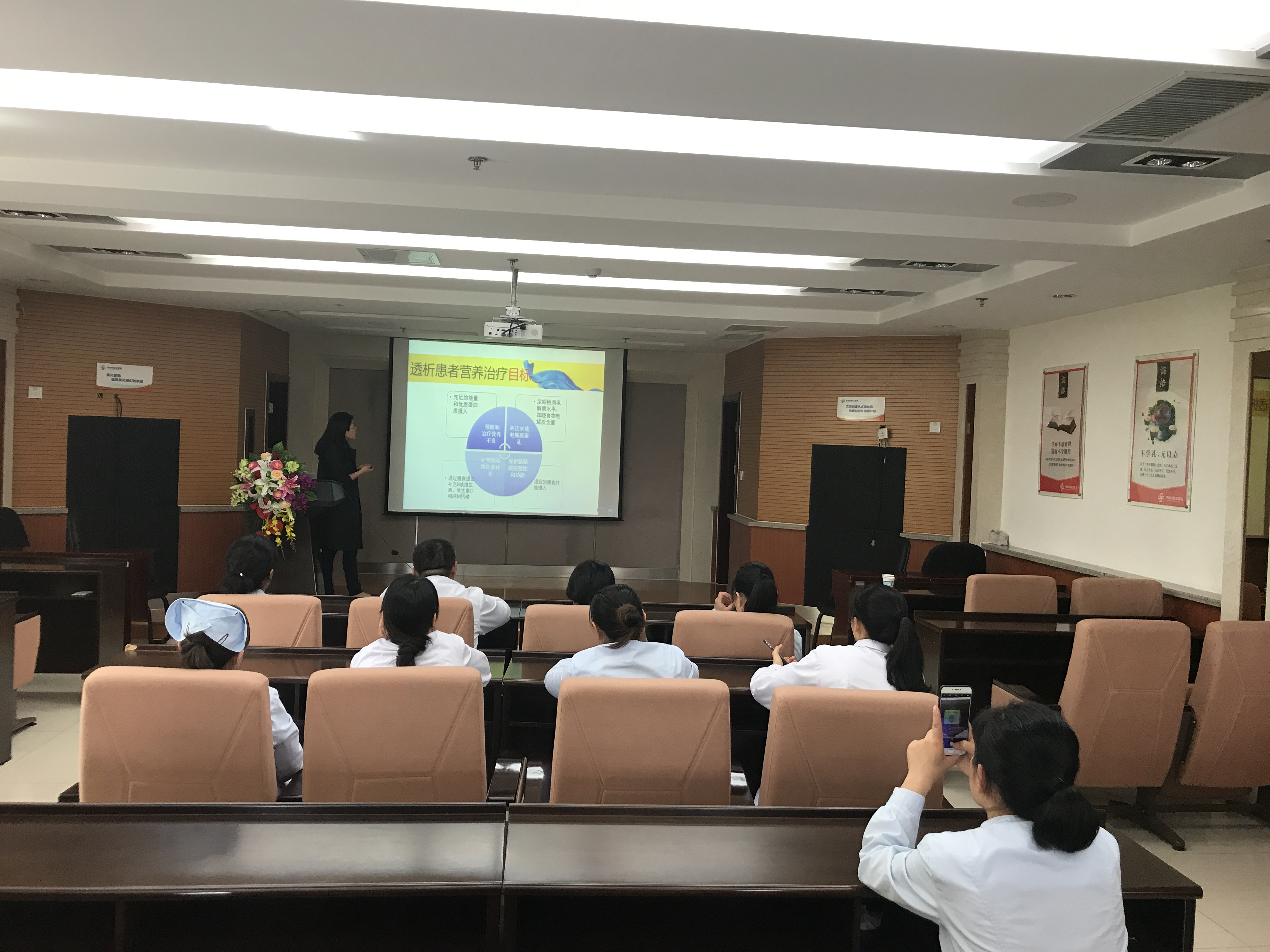 特邀北京费森尤斯卡比有限公司高级营养师在五楼会议室开展了一场题为《透析患者的营养》的讲座,血液透析中心全体医护人员参加了此次培训。