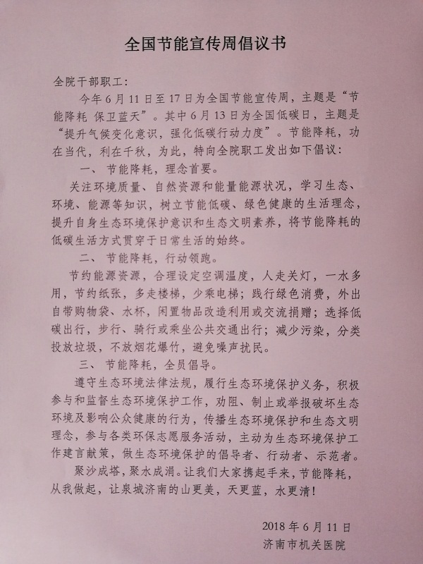 节能宣传周,我们在行动。自6月11日起,机关中文av “全国节能宣传周”活动已全面启动了。中文av 大厅LED屏上循环播放着此次“全国节能宣传周”的主题,宣传栏里张贴着节能降耗的倡议书,诊室里保持26度的恒温设置,办公室里尽量采用“无纸化”办公模式,这些无不展示着机关中文av 对“全国节能宣传周”的重视。