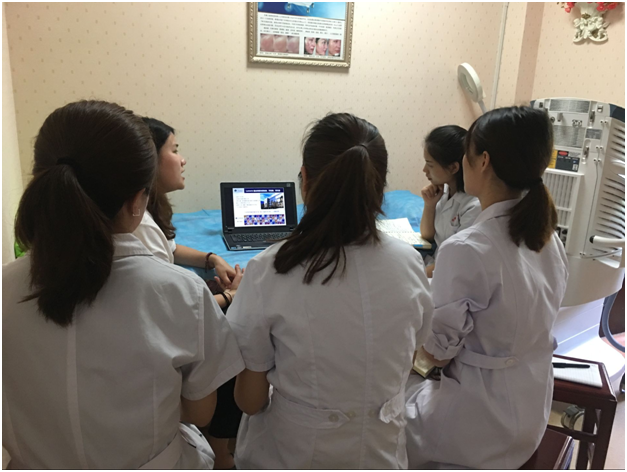特邀专家采用理论与实践相结合的方式,以讲解仪器的理论课件为开端,让大家深入了解了仪器的原理、适应症以及禁忌症。随后,在专家的指导下,皮肤科的医师们针对红血丝、嫩肤、细纹、黑头粉刺、疤痕等不同的疾病进行了临床实践操作,对仪器选择以及能量参数的选择有了更好的认识。培训会结束后,皮肤科医师们还针对临床常见问题及时与专家进行了有效的沟通与交流。