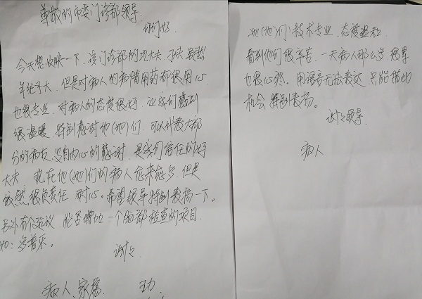 收到了一封特殊的来信,信件来自于患者家属王某。一封感谢信,字里行间全部都是对中医科巩雅欣大夫和刁哲明大夫的赞美与感恩。患者家属在信件里说,两位中医大夫虽然很年轻,但对病人的诊治却非常专业,而且态度温和。即使工作量再大,对接诊的每一位患者仍然能够做到认真负责,他们都是值得患者信任的好大夫。这位患者家属以朴实无华的语言,深情诉说了他的亲眼所见和亲身经历,讲述了患者及家属视角的医务人员,充满了无限温暖和感恩。