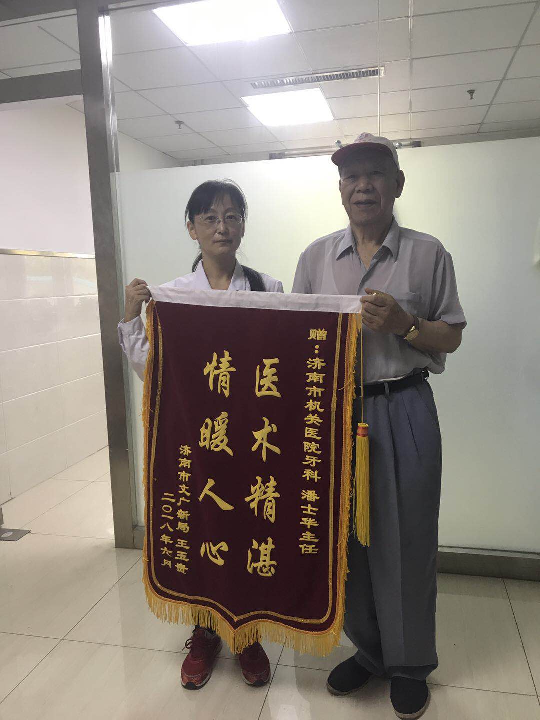 据悉,近两年,患者王玉贵曾多次因牙科疾病找潘主任诊治,均获得了很好的疗效。今年6月初,他在外出旅游时,牙齿突然出现剧烈疼痛。但本着长期以来对潘主任的信任,他毅然决定忍痛回济南找潘主任进行治疗。在潘主任的细心诊治下,一次便解决了病痛,而且通过后期治疗,不仅消除了牙齿炎症,还恢复了牙齿的正常咬合功能。患者对潘主任耐心的服务和精湛的医术满怀感激,特送来锦旗以示谢意。