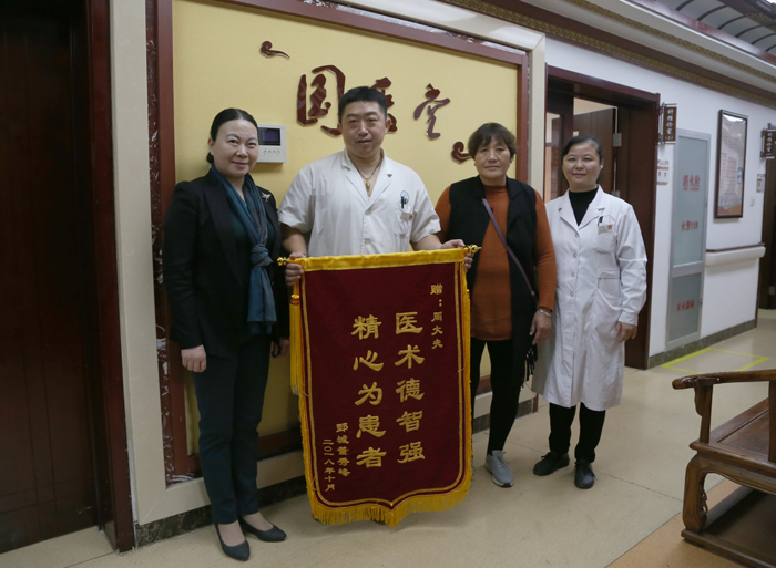 据悉,两个月前,董女士因膝关节肿痛,不能行走。董女士的女儿特为其联系北京的骨科专家行手术治疗,后因主治医生出国,遂慕名找到周大夫行中医针灸进行康复治疗。经过一周的针灸治疗,配合合理的运动康复训练,症状明显减轻,基本恢复运动功能,日常生活无不适。为表达感激之情,特携全家送来锦旗一面。