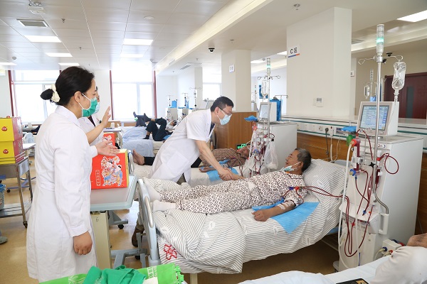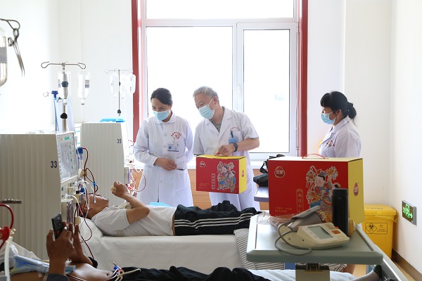 党委书记王俊峰,副院长渠鹏程、刘静带领相关科室负责人来到透析病房,看望慰问透析患者,并为他们送上了“安康粽”。