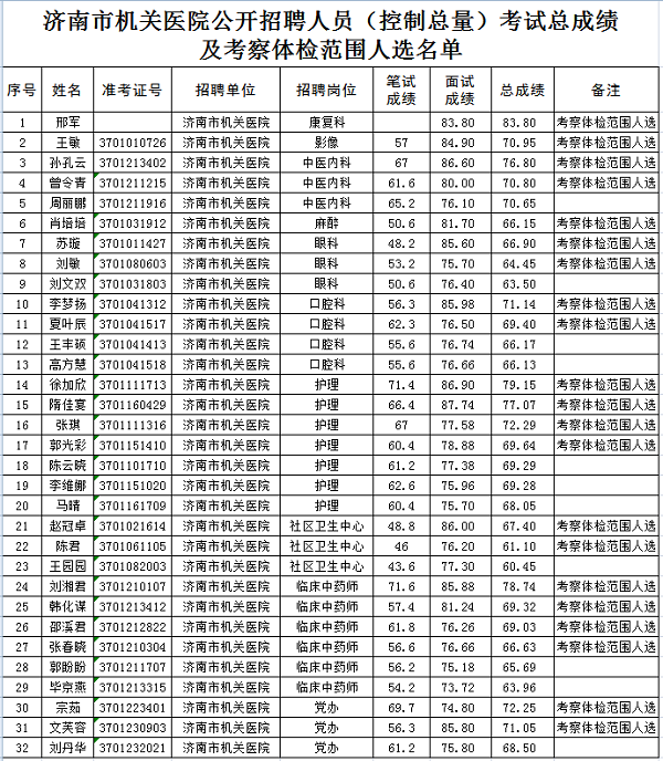 公开招聘人员(控制总量)考试总成绩及考察体检范围人员名单