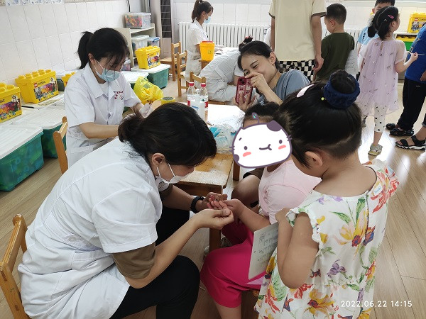 6月22日下午,干休所医护人员对省军区第四幼儿园165名儿童开展了免费健康体检。此次体检主要针对幼儿身高、体重、视力、龋齿、心肺听诊及血红蛋白等方面进行常规健康检查。