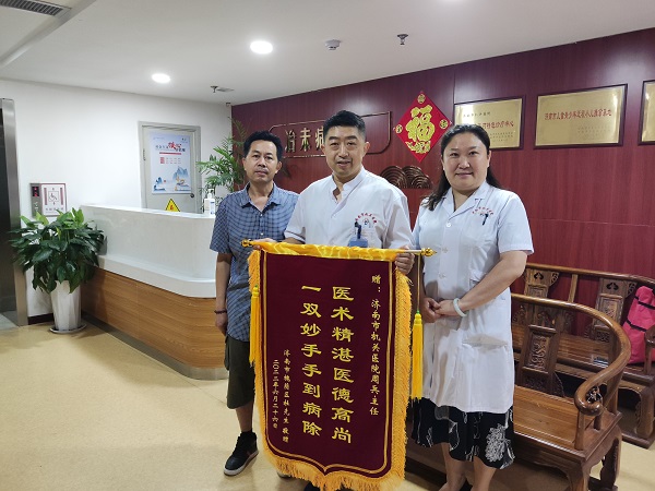 杜先生患有左耳耳鸣、右侧嘴角流涎,经家人介绍找到周大夫进行治疗。周大夫根据病情制定了针灸治疗方案,经过四次治疗症状明显好转,今天特意制作锦旗表示感谢。 “周大夫医术太好了,服务态度也好,我们家里人都找他。” 杜先生激动地说。