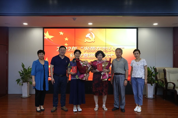 两名党龄满五十年的退休老党员颁发了“光荣在党五十年”纪念章,并送上鲜花以表敬意。
