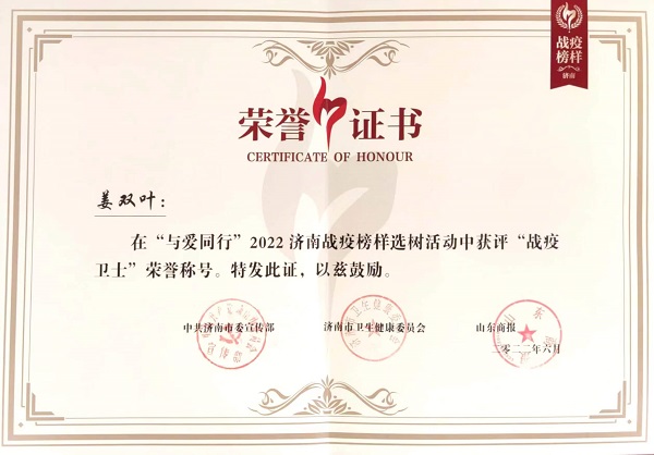 干休所社区卫生服务中心荣获“战疫团队”称号,护理部主任姜双叶荣获“战疫卫士”称号。