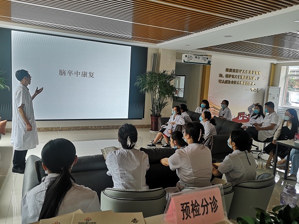 康复科负责人邢军首次开讲。邢军主任围绕脑卒中患者的发病机制、临床特点以及康复评定等内容,从脑卒中发病率、发病类型及各类型临床表现、患者急性期与恢复期的康复评定等方面展开全面细致地讲解。大家认真听讲,互相交流,取长补短,取得了良好的学习成效。