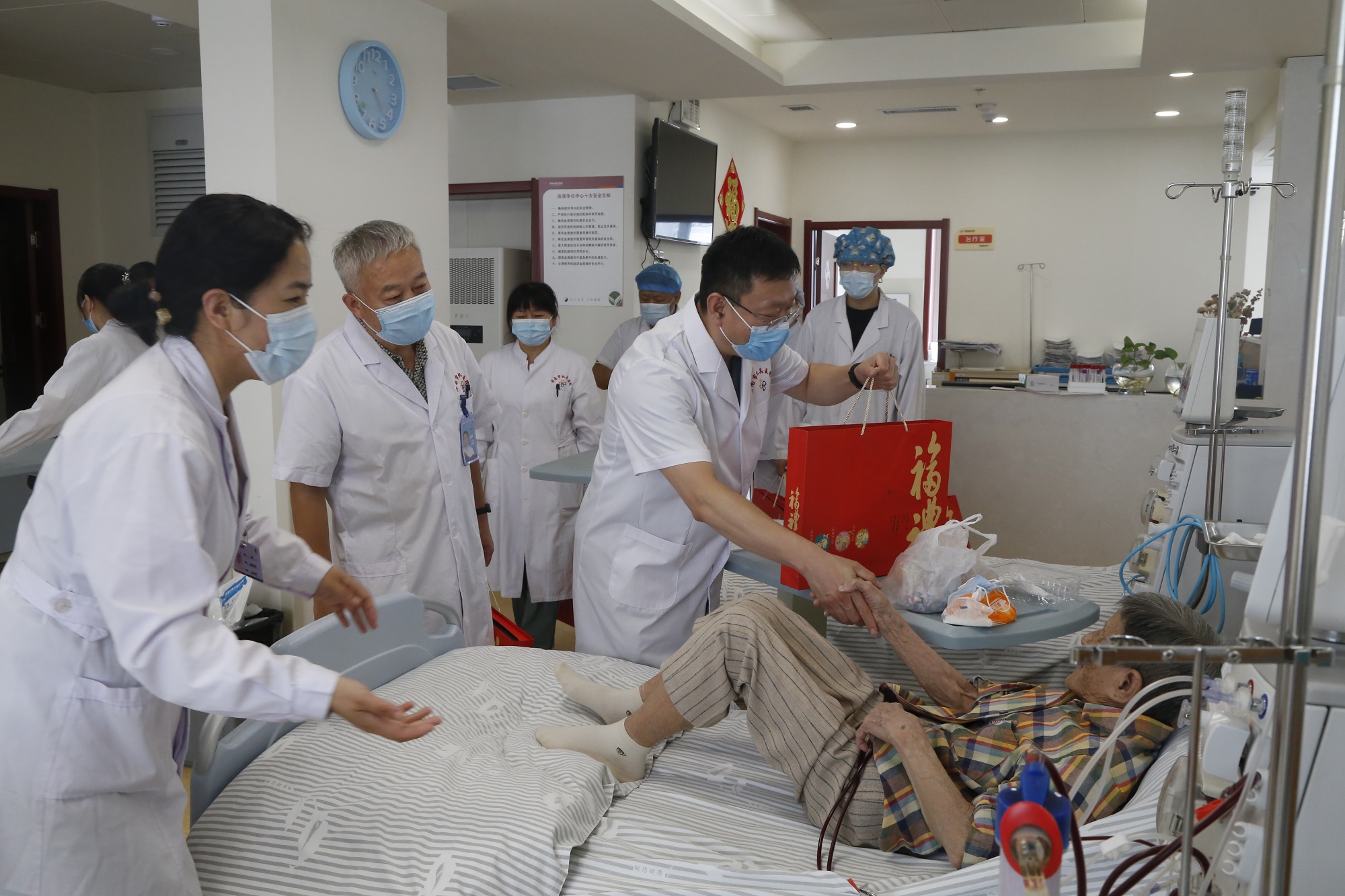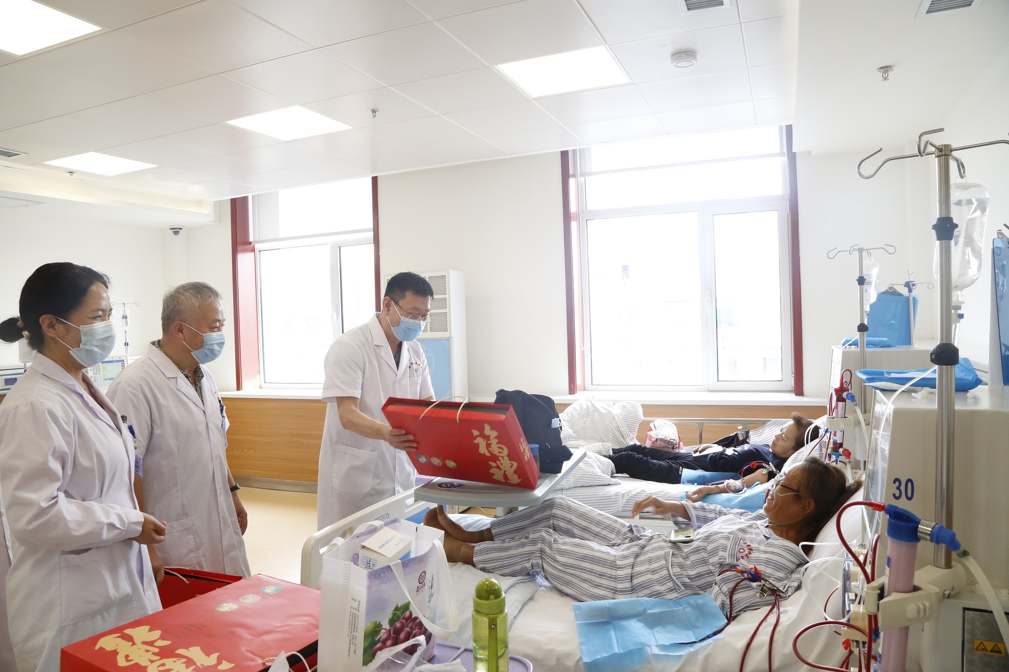 党委书记王俊峰、副院长渠鹏程、院工会主席董懿一行走进透析病房,慰问透析患者,把寓意团圆、平安的中秋月饼送到了患者手中,并为他们送去了节日的问候和祝福。