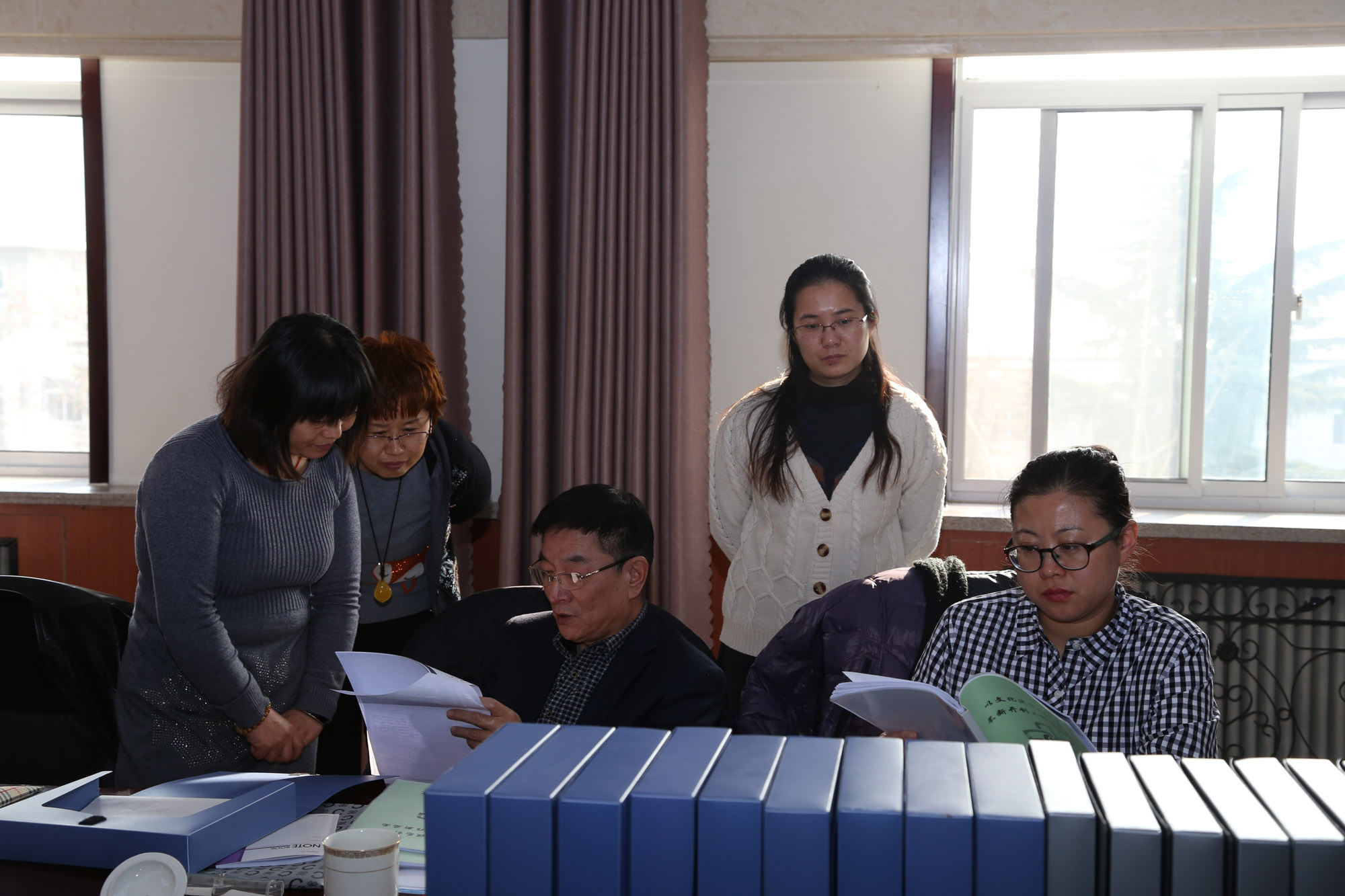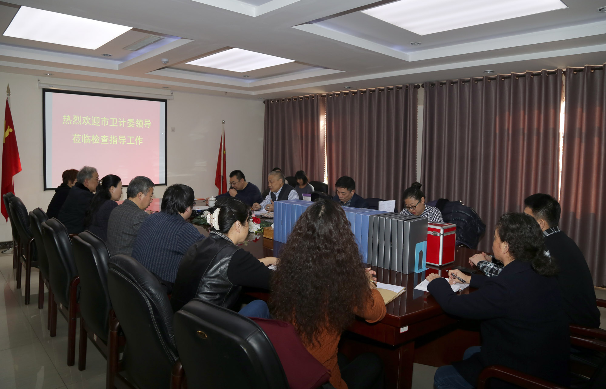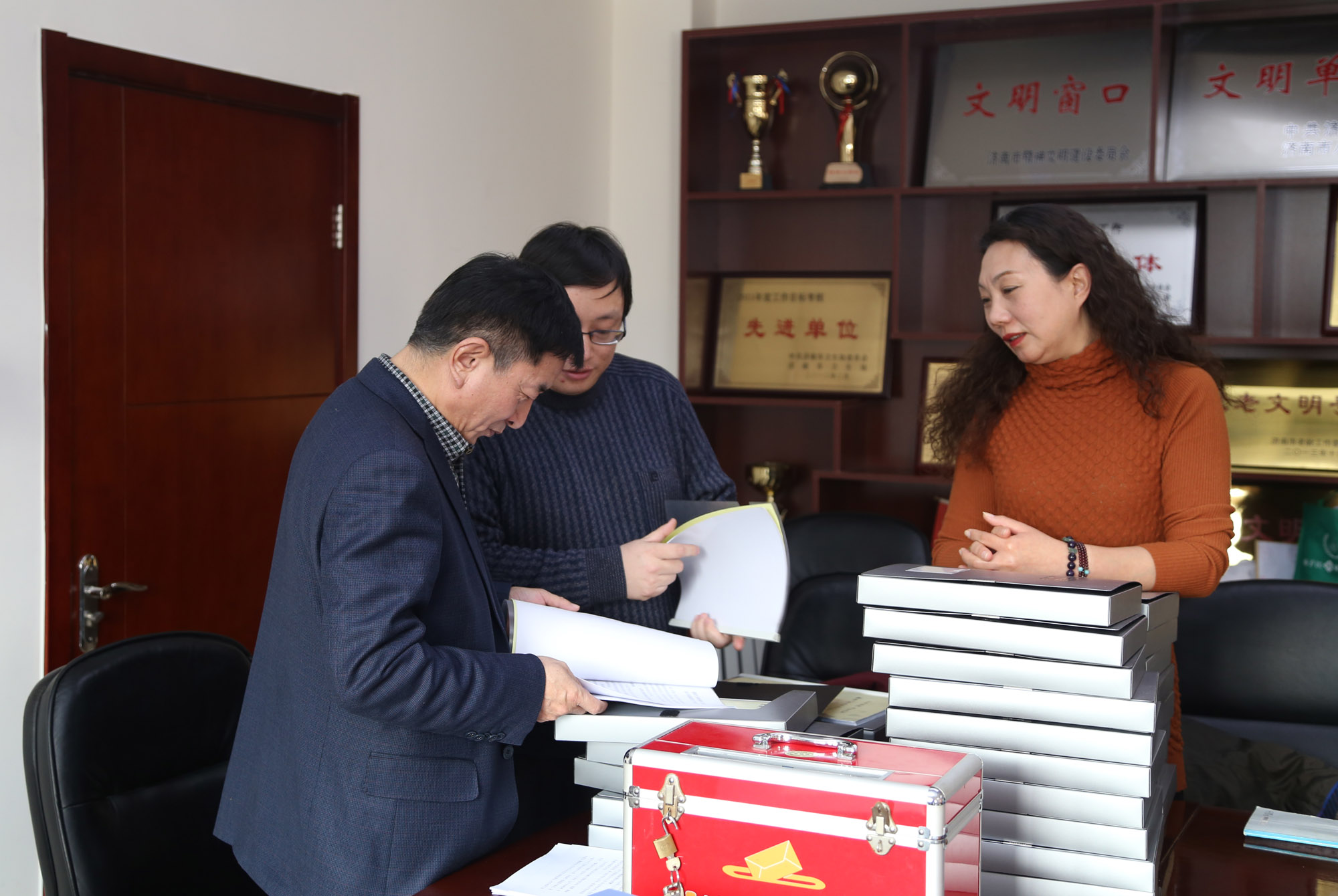 徐配印副主任首先讲解了考核流程,并对检查人员及相关检查内容做了简单介绍,要求考核组严格认真地逐一逐项对照检查标准进行检查。随后,检查组马素祥处长亲自开箱取出民主测评票,进行现场核对并装入信封。考核组成员按照各自分工,根据《2015年度济南市卫生计生系统工作目标考核细则》要求,对共同目标和业务目标的书面材料进行了认真对照检查。