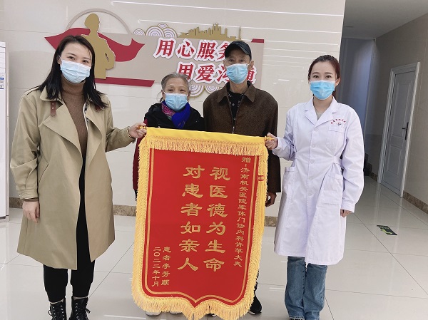 李阿姨说,自从军休门诊开诊以来,为他们的就诊带来了极大的便利,也为他们带来了高质量的健康生活。李阿姨的老伴李叔叔近两年血糖控制不理想,近期多次发生低血糖并伴随心慌心悸、手足汗出、乏力等症状。上月初,李叔叔再次发生低血糖症状来门诊就诊,许芊大夫及时予以施救,并做了妥善的处理,让李叔叔迅速转危为安。随后,许大夫发挥中医优势,结合中医针刺穴位,为李叔叔缓解不适症状,后经专业调理,目前李叔叔的血糖控制良好,症状稳定,也没再出现呼吸困难和胸闷心慌等症状,身体恢复较好。为表达感激之情,李阿姨和李叔叔特送来一面锦旗表示感谢。