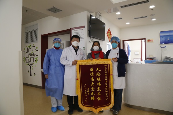 院长徐雷与血液透析科负责人刘苗一起接过了患者的锦旗。