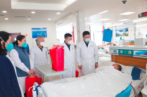 党委书记王俊峰,党委副书记、院长徐雷带领院领导班子走进透析病房,看望慰问透析患者,并为他们送去了新春拜年礼包。