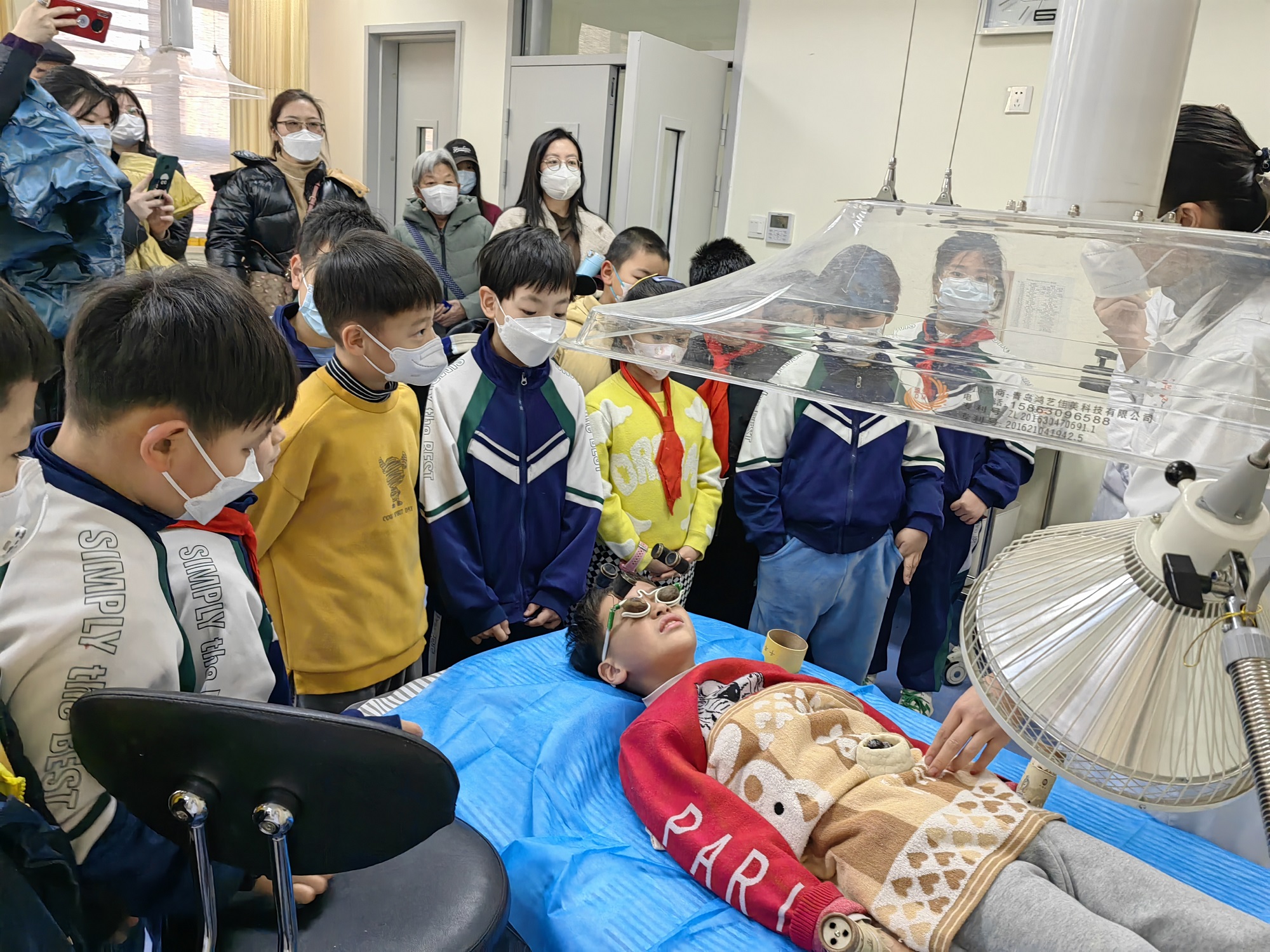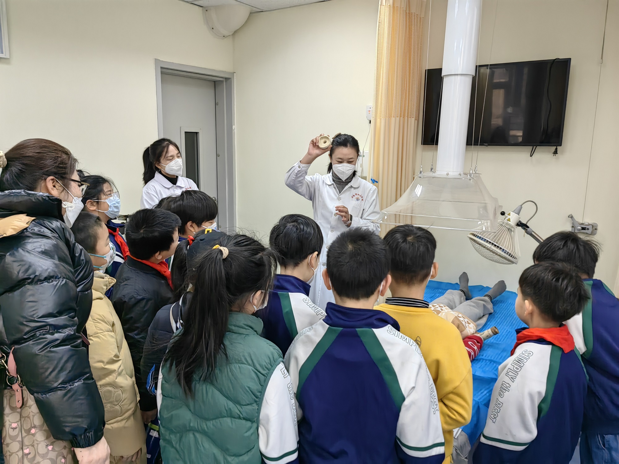 在医务人员的带领下,少先队员们开启了“走进中医,了解中医”之旅。在小儿推拿中心,医务人员向学生及家长介绍了儿科常用的各种灸疗方法,主要包括眼睛灸、脐灸、节气灸等,并现场展示了具体操作,让学生们了解了中医治病的神奇方法。