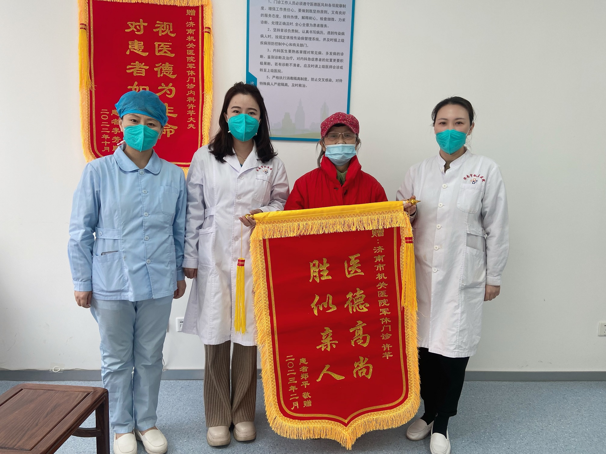 军休门诊再次上演温情一幕:82岁高龄的郑奶奶将一面鲜红的锦旗送到了内科大夫许芊和护士刘姗姗的手中。“感谢你们对我的精心治疗,你们就像我自己的孩子一样,在我身边,让我安心!”