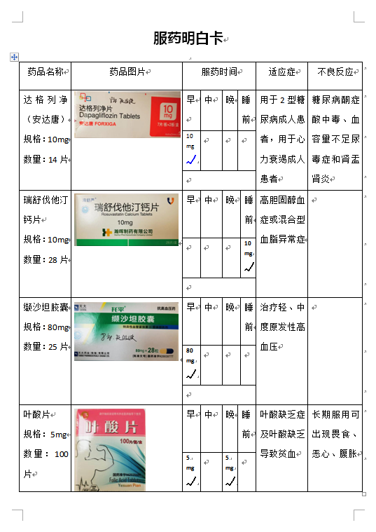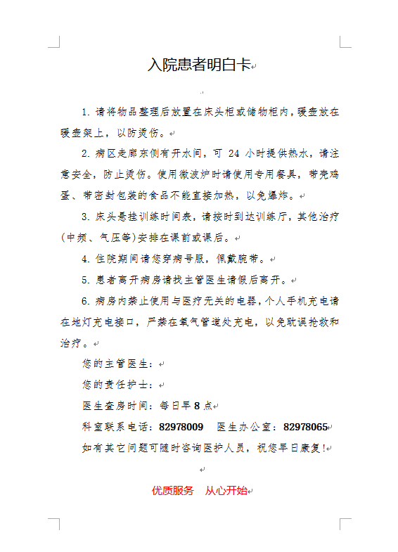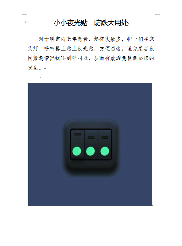 入院前,加强护患沟通,为患者准备“入院明白卡”,对入院注意事项逐一进行详细说明,使患者尽快熟悉入院流程;入院后,制作“小小夜光贴”,为患者贴在床头灯、呼叫器的开关上,方便患者夜间使用,有效避免跌倒坠床;出院时,发放患者“用药明白卡”,遵照出院医嘱,将药品名称、用法用量等事项印到卡片上,科学指导用药。