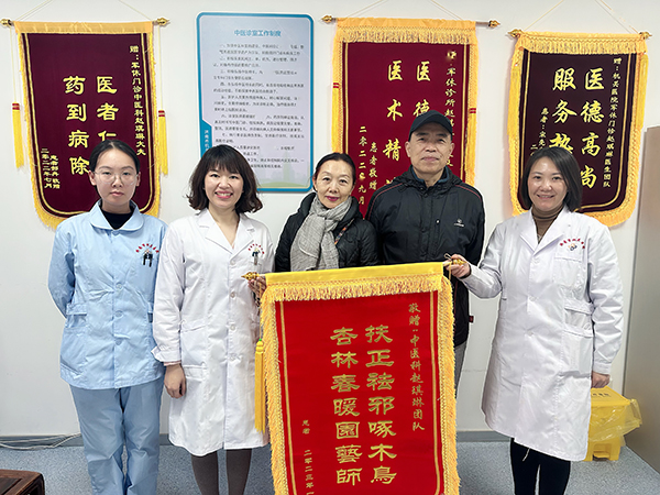 2022年6月,彭先生因胃胀反复三年、先后服用多种药物治疗效果均不明显,后经人介绍到军休门诊中医科就诊,赵大夫在详细了解患者的病情后,结合节气特点,采用中药塌渍联合灸疗为其调理。三个月后,彭先生症状基本痊愈,至今未再复发。为表感谢,彭先生特意制作了一面锦旗,送给了军休门诊中医科团队。