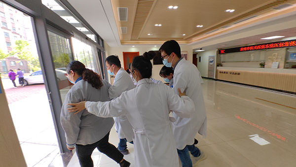 培训结束后,东院区全体职工按照应急演练脚本,针对医疗机构出现火情后,如何及时报警、协助行动不便患者尽快疏散逃生、使用消防器材扑灭初起火情等问题进行了应急预案演练。