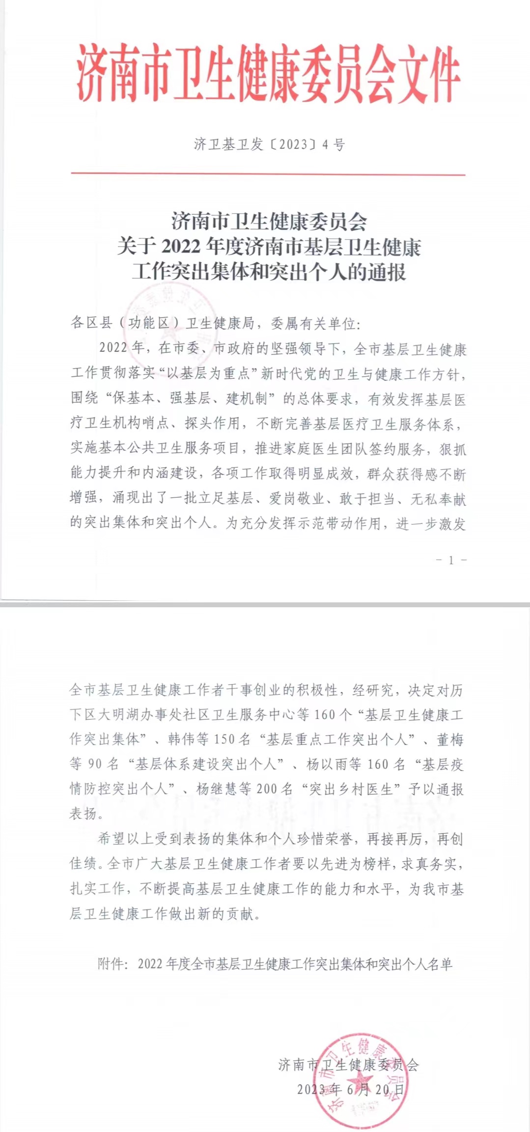 6月20日,济南市卫生健康委员会通报表扬2022年度全市基层卫生健康工作突出集体和个人,中文av