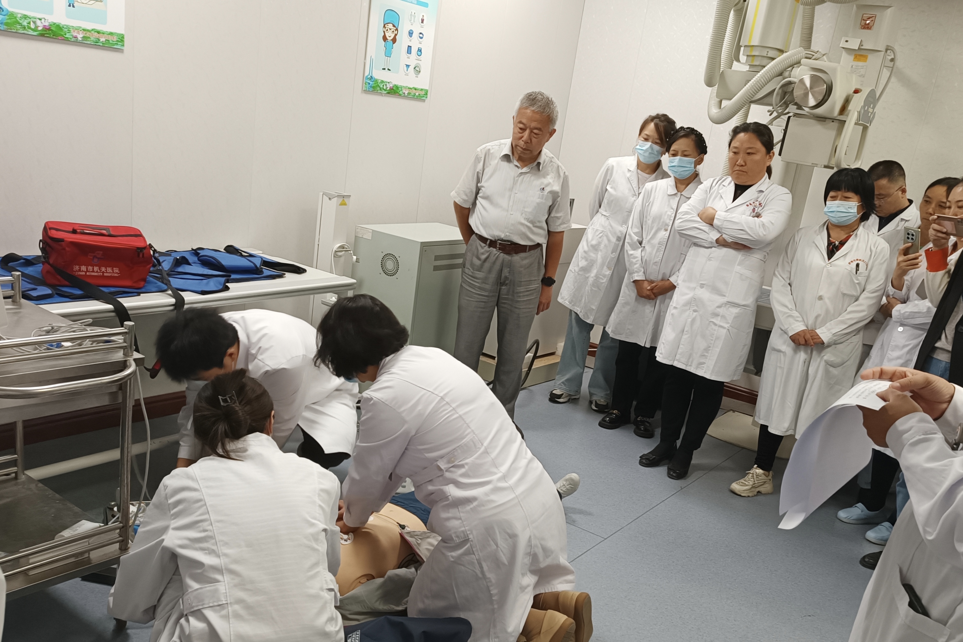 组织全体医护、医技人员开展心肺复苏急救演练,专职党委副书记刘静全程指导,副院长渠鹏程任演练总指挥。