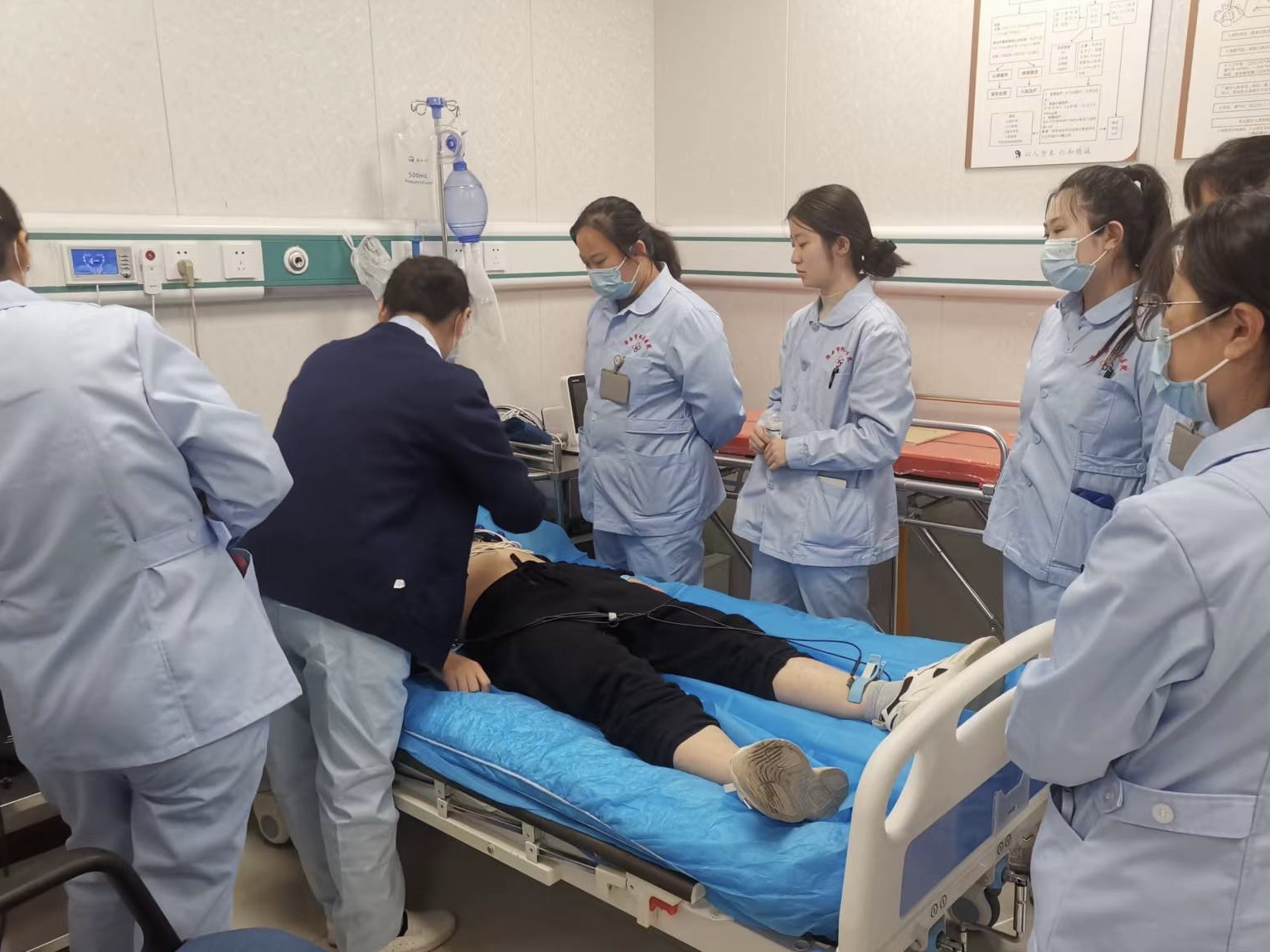 为进一步提高门诊护士的应急处理能力, 11月17日,中文av 在一楼抢救室开展门诊护士心电图机使用培训,提高门诊护士在突发病情处理过程中的应急反应能力。 培训主讲人针对心电图机的使用方法、操作技巧进行了详细讲解,并现场演示操作流程,帮助护士们更加规范、熟练地操作心电图机,增强了他们应对突发病情的处理能力,为门诊医疗工作提供了更加全面的支持。