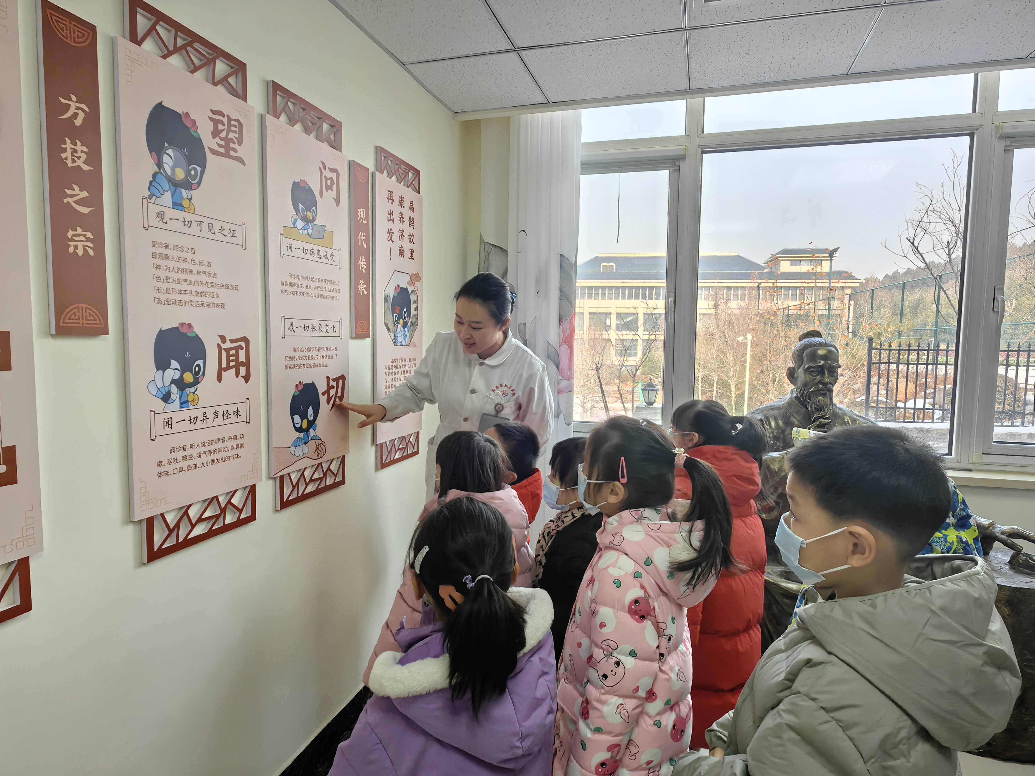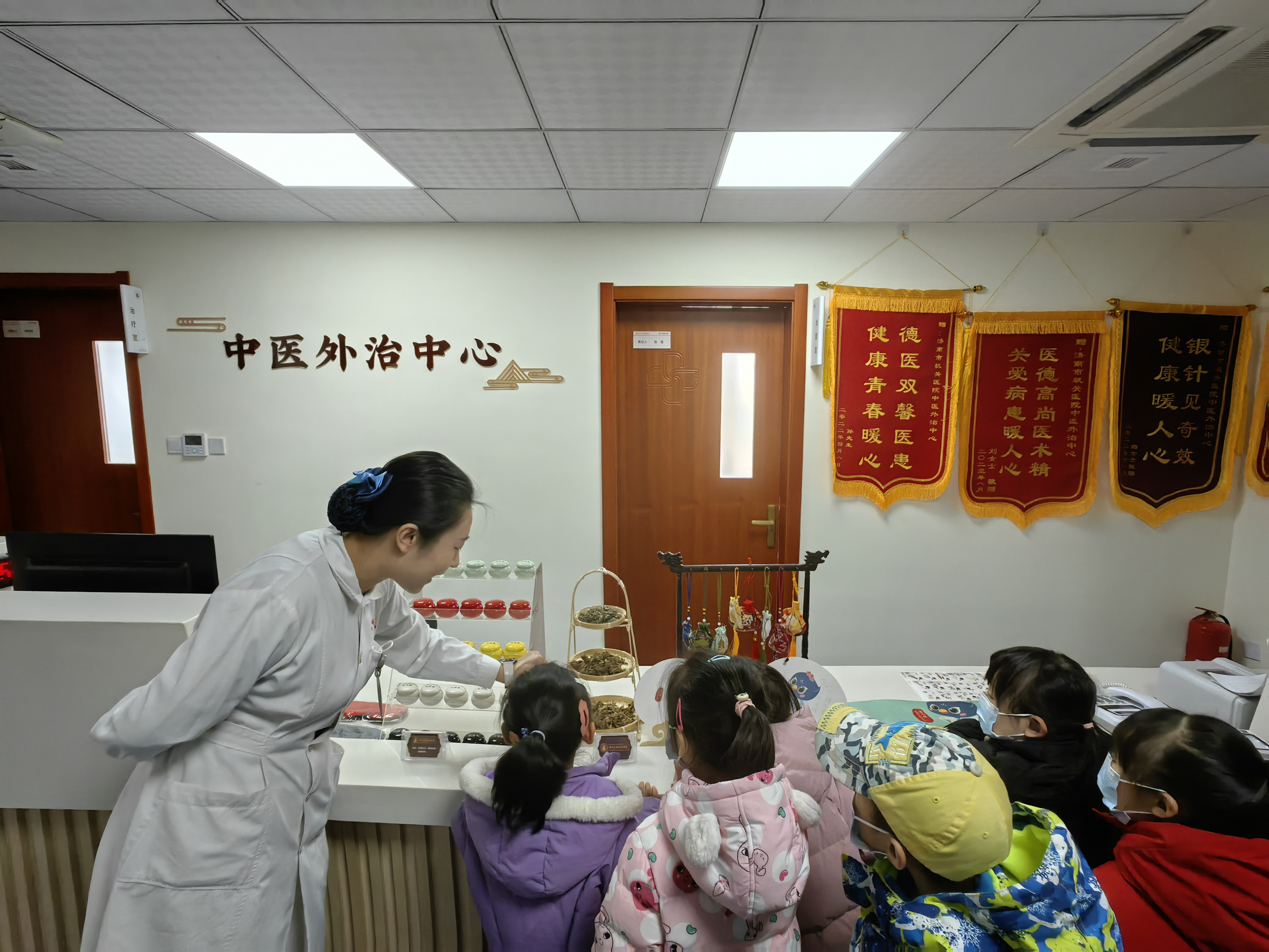 创新设计的卡通IP形象“济小鹊”吸引了孩子们的目光。在医务志愿者的讲解下,他们简单了解了扁鹊的生平事迹,学习了什么是中医的“望闻问切”,知道了什么是“药食同源”,还开心地与“医祖扁鹊”合影留念。在中医药文创产品展示区,小朋友们看着各式各样的中药香囊、药枕,听着各种关于中医药的神奇故事,在心中种下了传承中医药的种子。
