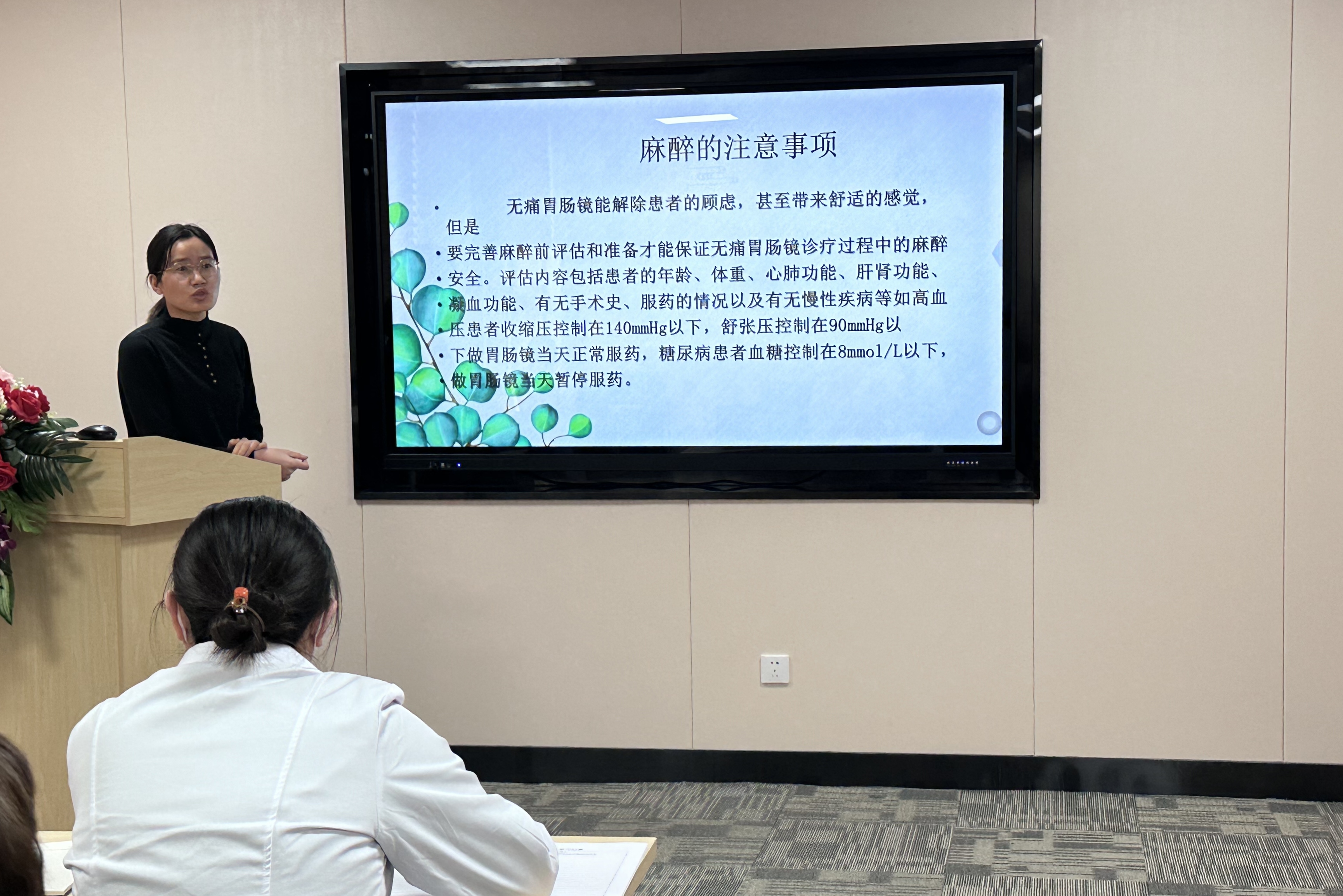 培训现场,内镜室负责人林深为大家详细讲解了胃肠镜的适应症、禁忌症,以及术前准备流程、注意事项等内容。随后,麻醉医生补充讲解了无痛胃肠镜麻醉前的注意事项,内镜室护师对术前清肠药物的使用、饮食调整及检查当日的相关事宜进行了简要陈述。