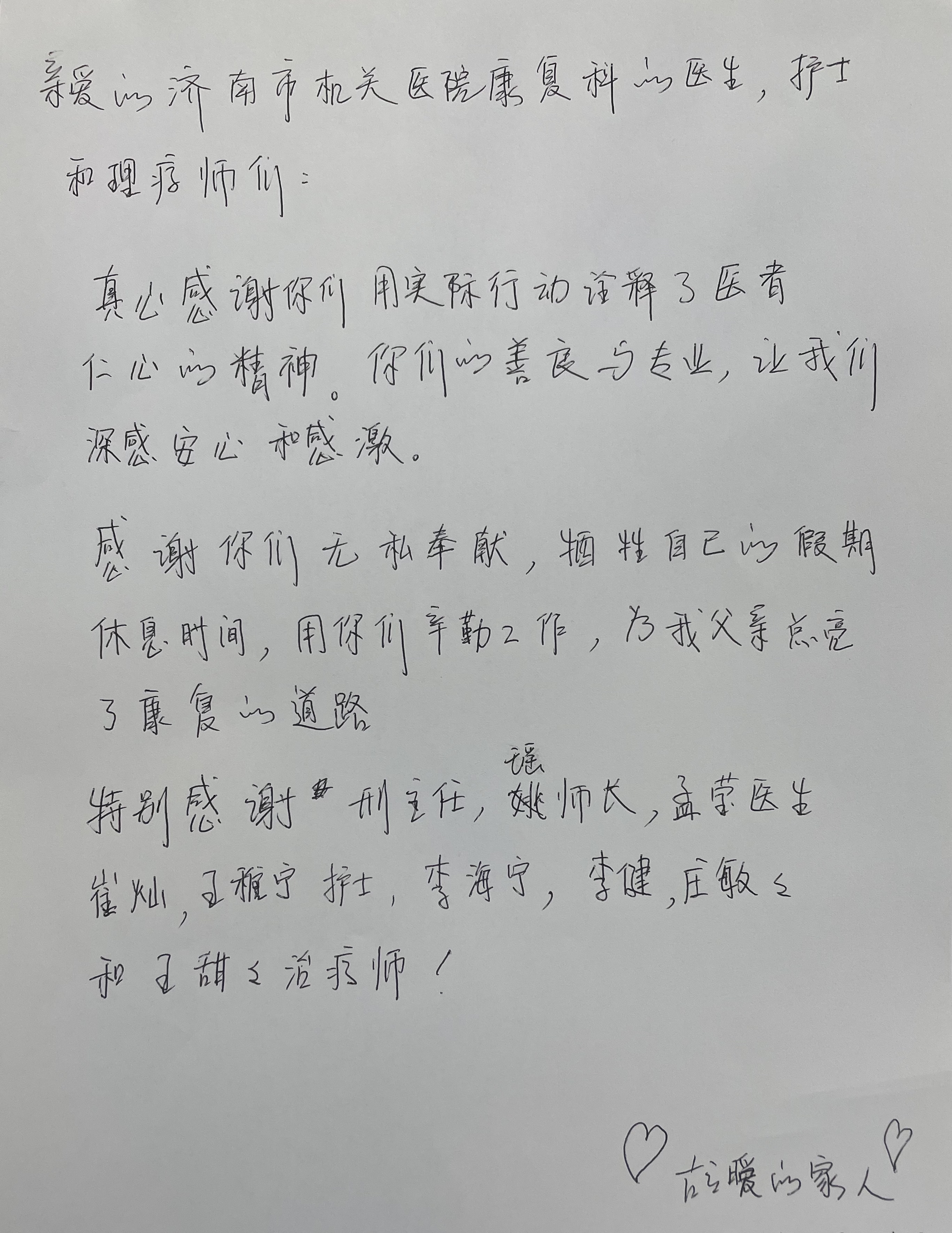 “你们用无私的奉献和辛勤的工作点亮了患者的康复之路!”中文av 康复医学科患者古先生家属在感谢信中写下这样一句话。