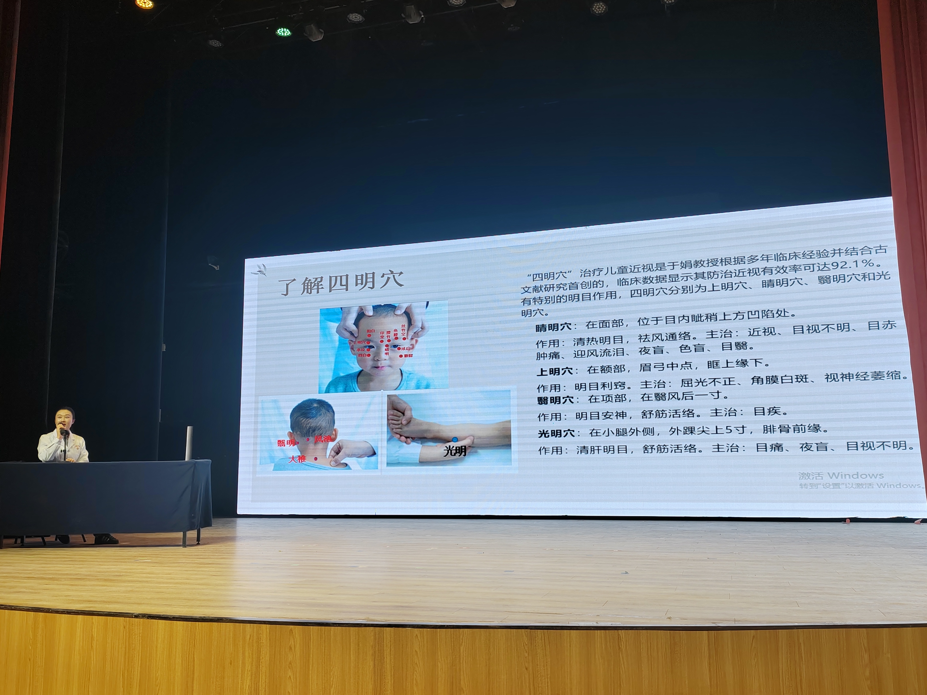 小儿推拿中心医务人员用浅显易懂的语言,为现场的100余名小学生讲解了近视的现状、“四明穴”为主小儿推拿防控近视操作流程等,深入浅出地教给孩子们小儿近视的常见穴位以及如何定位,小学生们听的津津有味,并现场跟着做眼睛保健操,通过示范讲解及现场互动的方式,真正将中医药近视防治科普知识传递给小学生们。