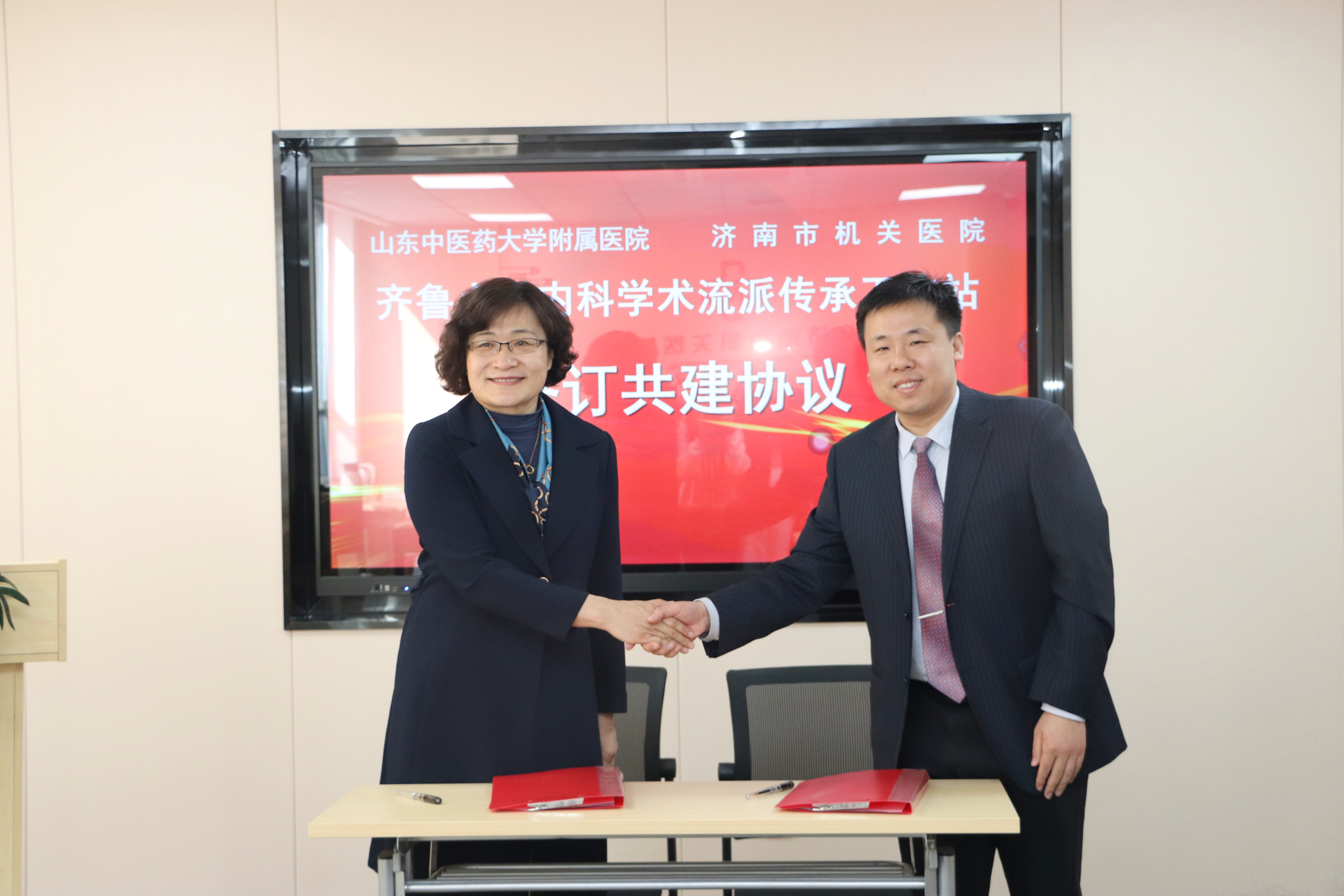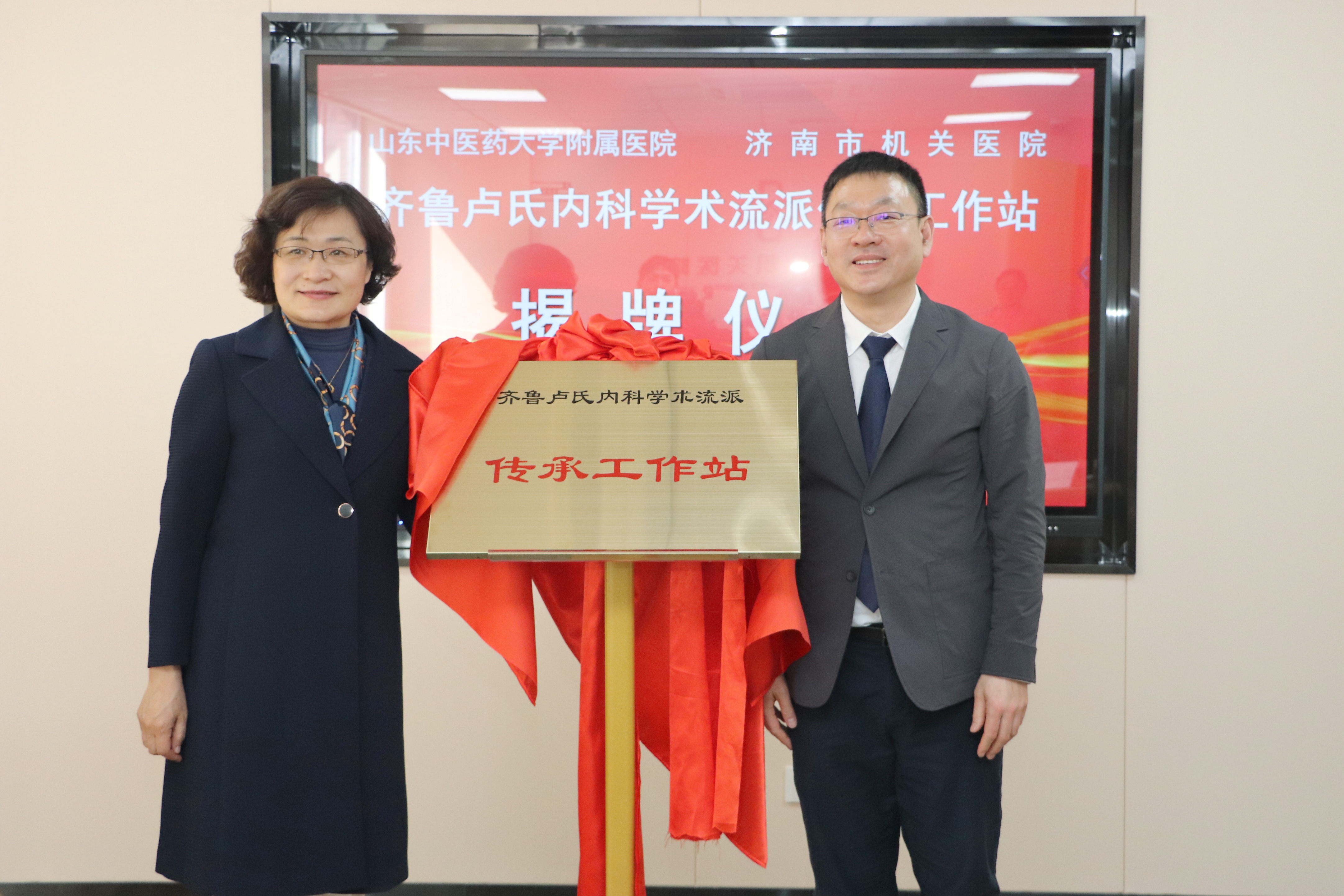 随后,卢笑晖主任与徐雷院长现场签订“齐鲁医派卢氏内科流派传承工作室”共建协议,与王俊峰书记为“齐鲁卢氏内科学术流派传承工作站”揭牌。