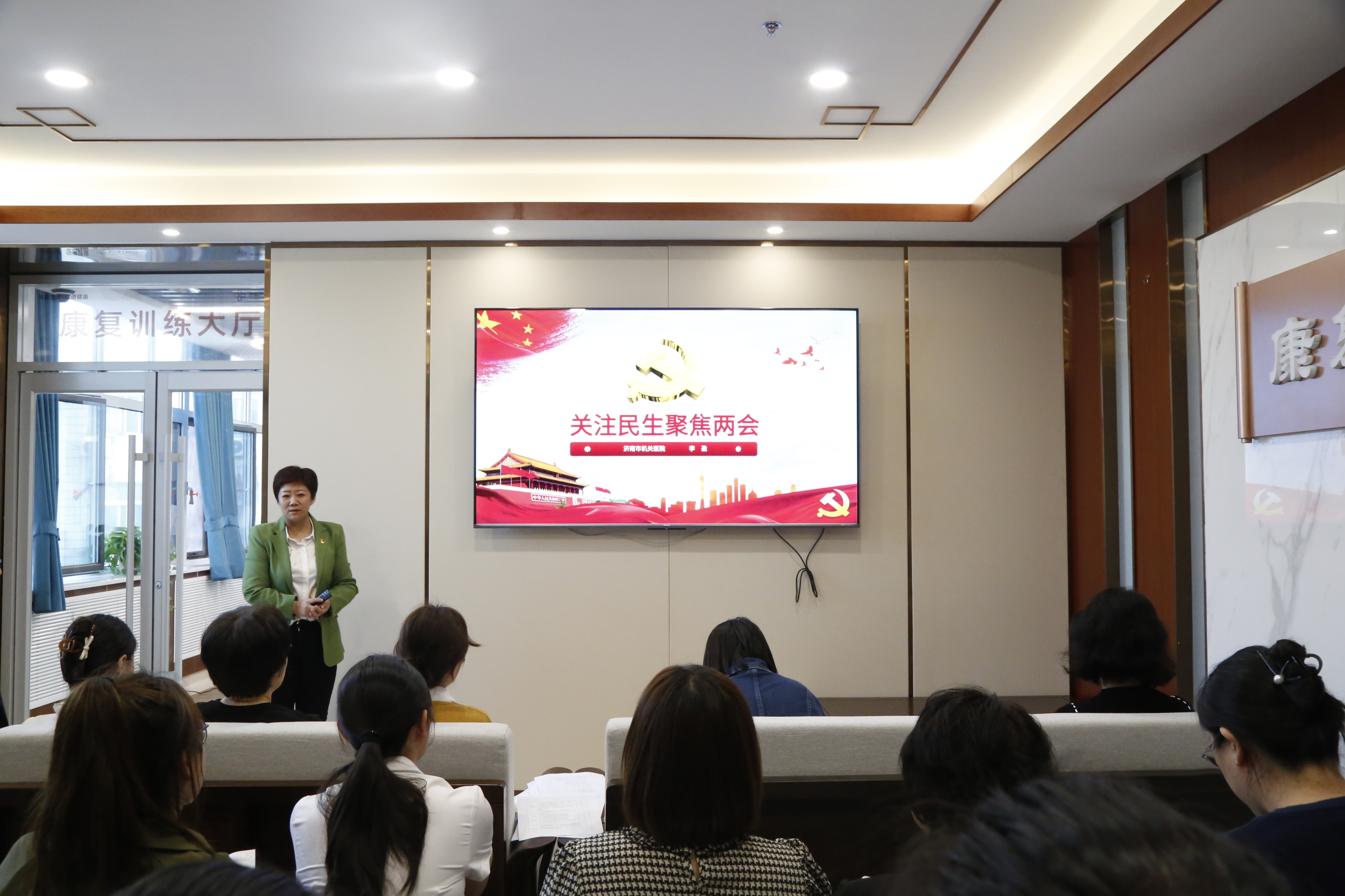 院区党支部书记李盈以《关注民生聚焦两会》为题,从2024年的两会基本情况、五大看点和政府、政协工作报告四个方面入手,详细介绍了报告中有关医疗、消费、社保等方面的内容,并选取多个两会热词进行详细解读。