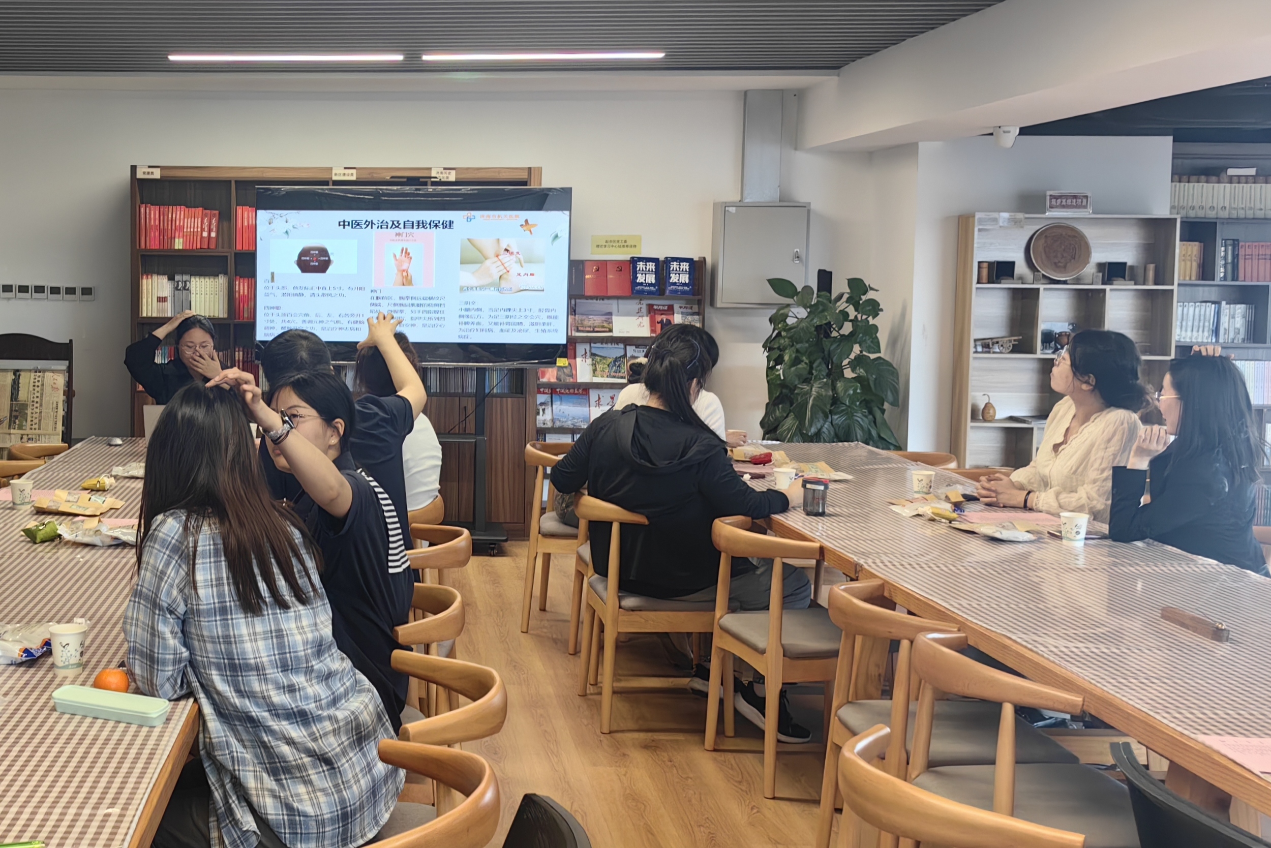中医师王舒舒担任主讲,针对久坐办公人群的亚健康状态,运用中医保健的理论,为大家详细讲解了失眠、焦虑、颈肩综合征等常见疾病的发病机制、中医辩证及外治疗法,科普居家保健常识。随后,主讲人又为大家介绍了经络走向、穴位定位以及穴位按压的小窍门等,让大家现场体验到了中医外治的神奇功效。