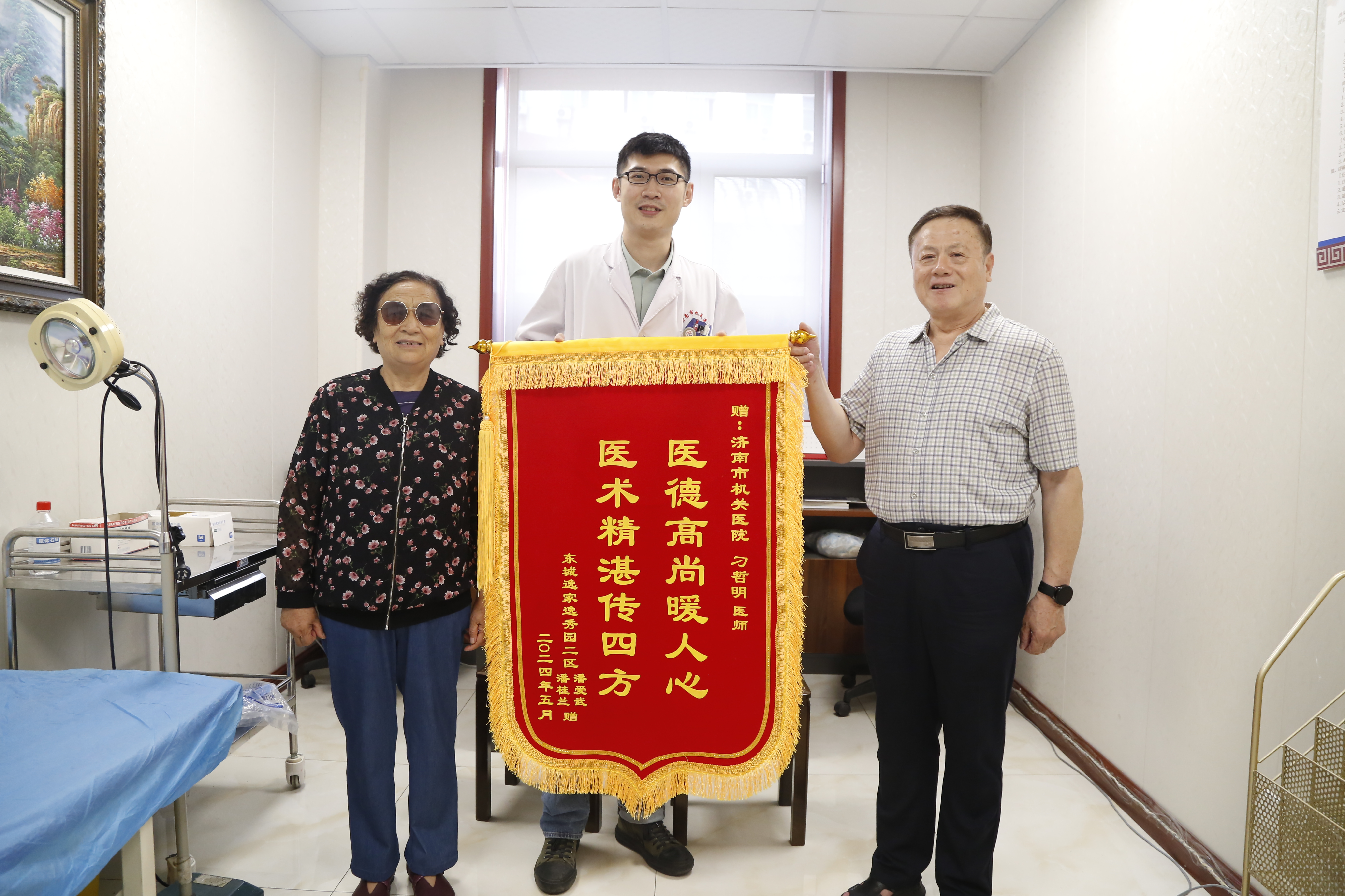 5月21日上午,患者潘女士、潘先生姐弟二人也送来了一面绣有“医德高尚暖人心,医术精湛传四方”的锦旗,感谢老年病科刁哲明大夫。