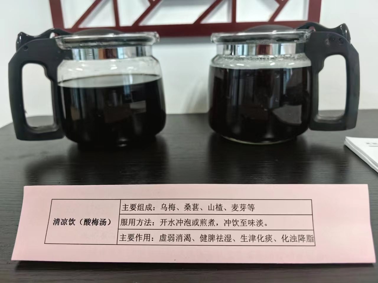 清凉饮(酸梅汤)是中国传统的夏季解暑生津饮料,其基本原料是乌梅、山楂、甘草、陈皮,冰糖,辅以洛神花、桂花,乌枣、桑葚、薄荷、枸杞等。具有消食和中、行气散瘀、生津止渴、除烦安神之功效,非常适合盛夏时出现食欲不振、口干少津、倦怠乏力的人群饮用。