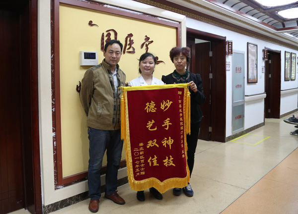 理疗科治疗。针对贾女士的病情,理疗科赵主任制定了详细的诊疗方案,通过中医的中药针灸 拔罐等综合治疗,贾女士的病情得以好转,胃痛得到极大缓解。为表达谢意,特送来“妙手神技德艺双佳”的锦旗以示感谢。