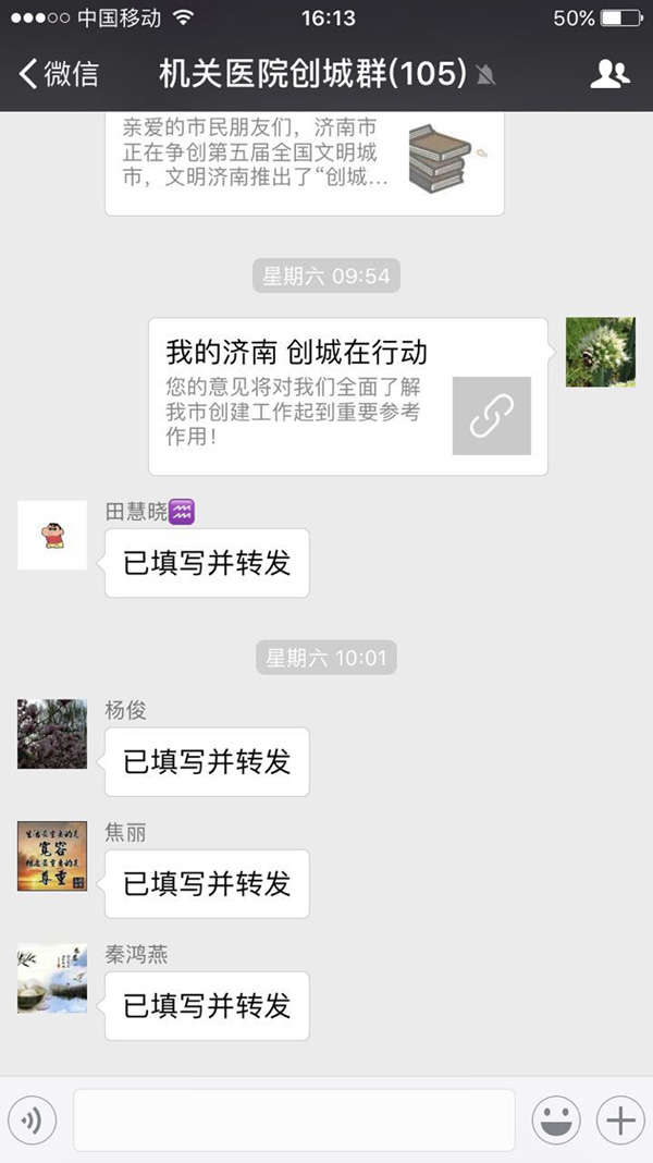 济南市创建全国文明城市已进入冲刺阶段,问卷调查是文明城市测评验收的一项重要内容。为进一步加强创城宣传,普及创城知识,了解创城民意,近日,机关中文av 积极组织全体职工进行填写提交创城问卷调查活动。 本次活动中,中文av 通过发放问卷、网上填写提交《全国文明城市测评调查问卷》等多种方式,在全院范围内提高了文明创城的知晓率、覆盖率、参与率,提升了职工的创建意识,为我市创建文明城市贡献自己的一份力量。(胡孝娣)
