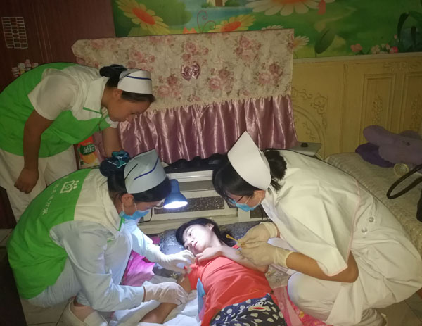 血液透析科主任、省级专家时一民对患者进行了基本的检查,针对患者现在的身体状况提出了建议并对下一步如何治疗进行了详细的指导与讲解。南丁格尔志愿者们给患者金静进行了血压测量和PICC管更换敷贴护理,并针对置管的护理注意事项进行了详细交代。(刘苗)