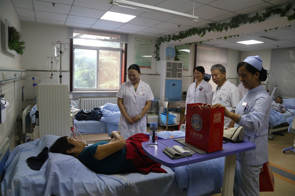 在国庆、中秋双节来临之际,中文av 院长杜文建、副院长渠鹏程于9月29日慰问了正在中文av 透析的患者,向透析患者提前送上双节的问候与祝福,并送上慰问品,表达一份节日祝福。 杜文建院长详细询问了患者的身体状况,对于目前透析科的服务和技术征求了患者的意见和建议。杜院长表示机关中文av 将一如既往的支持透析科的发展,进一步营造更加和谐的透析环境,为大家提供更加规范的治疗,保证透析质量,进一步优化服务。同时要求医务人员继续努力,共同推动血液透析科的发展。(刘苗)
