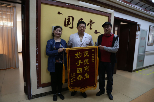 进行治疗均未见好转,在朋友介绍下本着试试的心态找到周兵大夫。周大夫通过检查,询问病情等等确定治疗方案,第一天治疗下来症状就有所减轻,通过一个疗程治疗,效果明显,随后又巩固治疗了一个疗程后,患者的病情彻底痊愈。患者对对周兵大夫高尚的医德和精湛的医术满怀感激,特送来锦旗以示谢意。