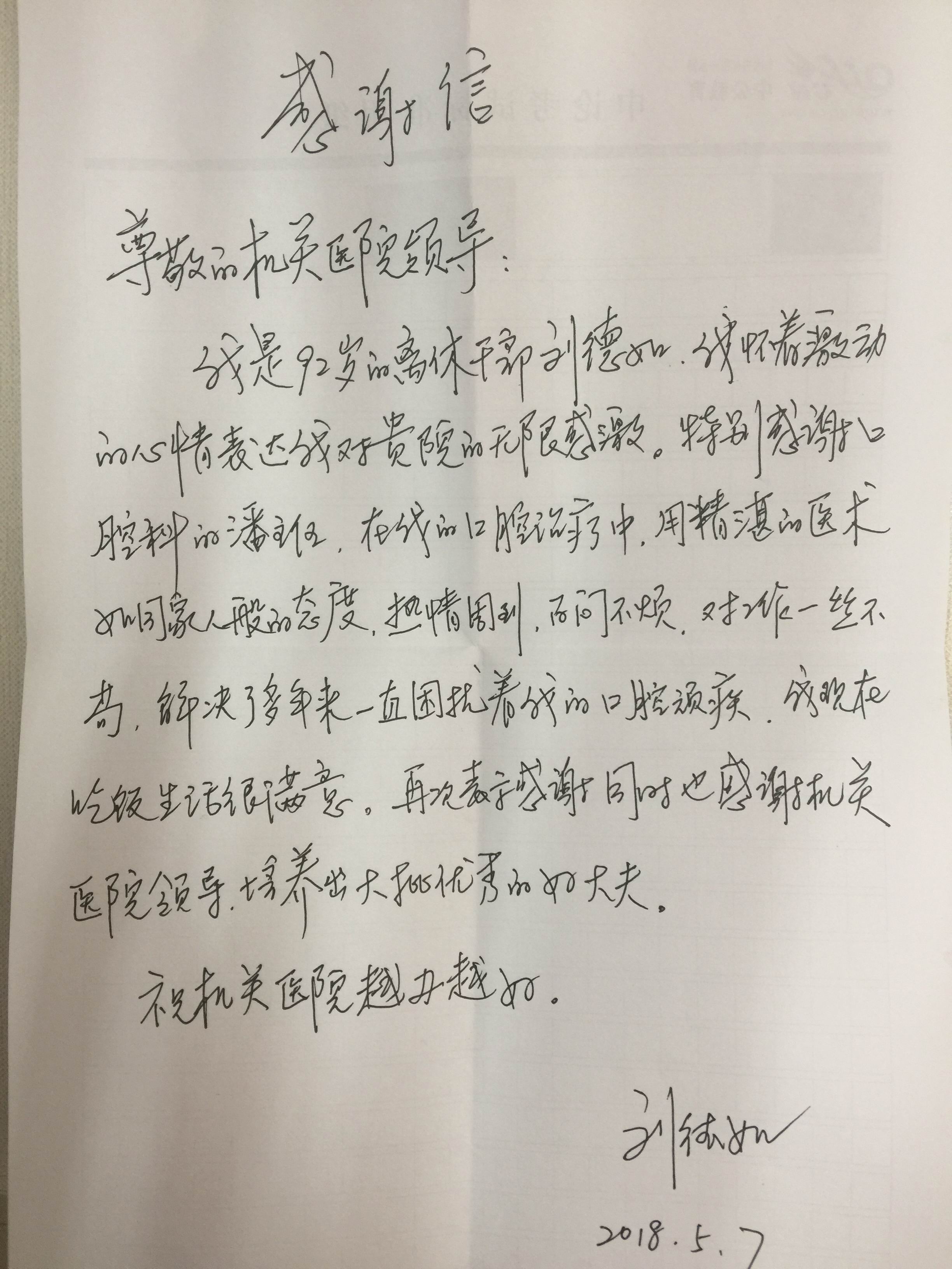 口腔科主任潘士华大夫的细致诊疗下,感受到了如同家人般的热情服务,现终于可以正常的吃饭和生活,非常激动,于是亲自给潘大夫送来了一封感谢信。