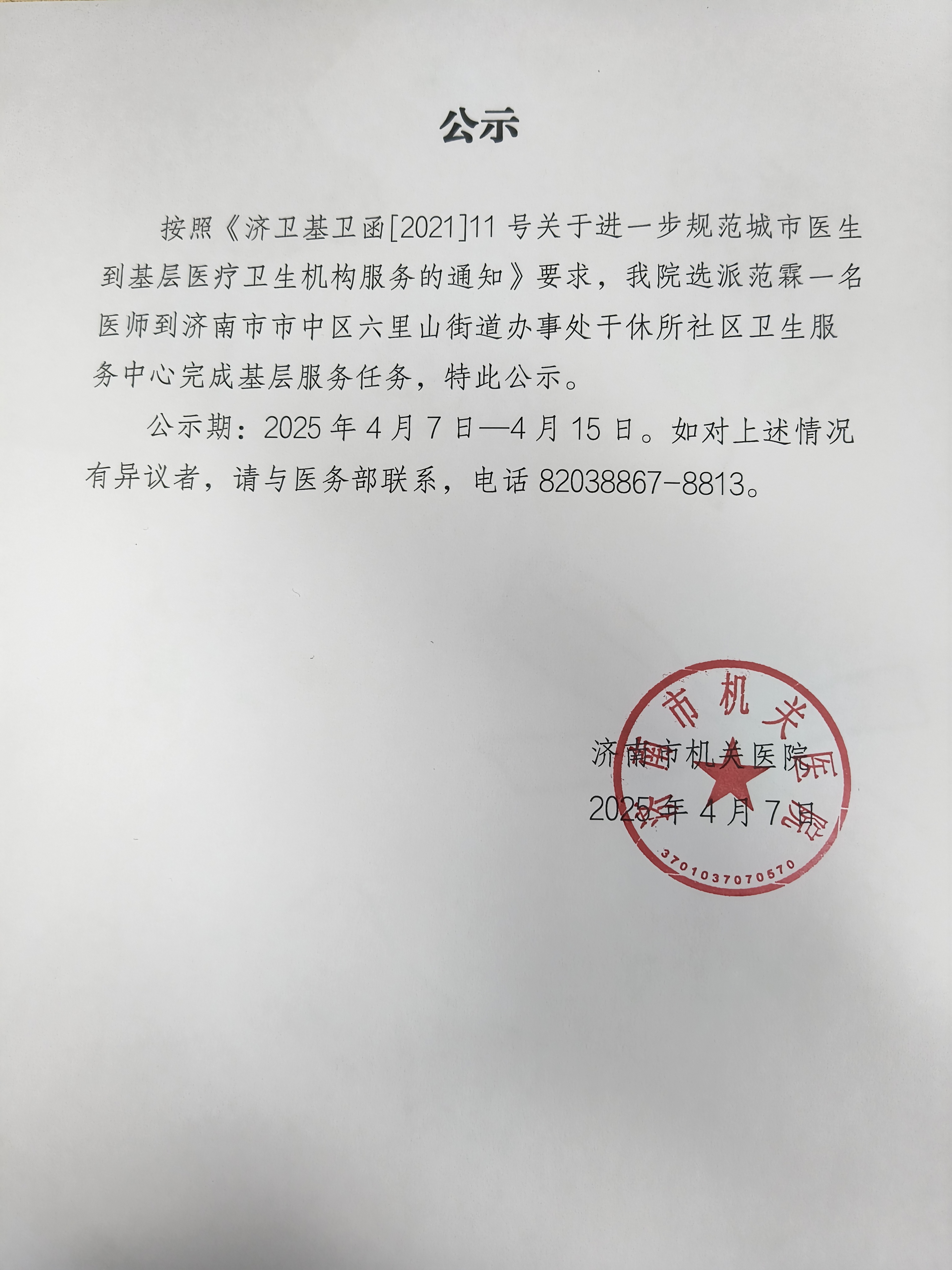 关于范霖医师完成基层服务任务的公示