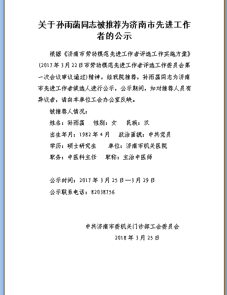 关于孙雨菡同志被推荐为济南市先进工作者的公示