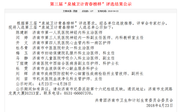 济南市卫计委第三届“泉城卫计青春榜样”评选结果公示