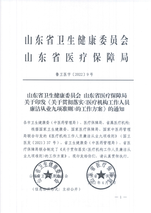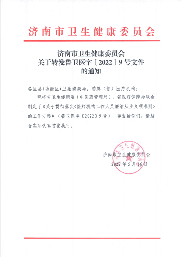 转发济南市卫生健康委员会关于转发鲁卫医字【2022】9号文件的通
