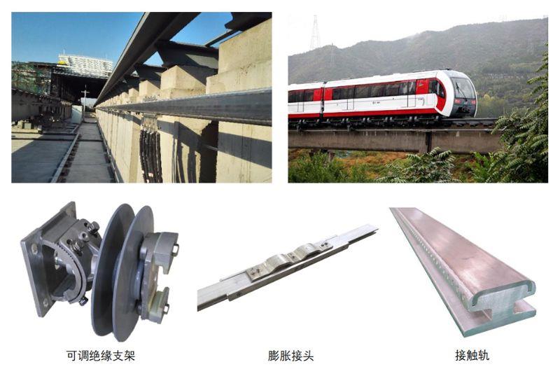 中低速磁浮钢铝复合接触轨架设在轨道梁两侧,通过受流器以侧向授流方式向机车传输电能。接触轨导电性能好,承载电流大,绝缘支架具备三向可调功能,能够有效解决由于土建误差造成的接触轨安装问题,并且有效防止接触轨的竖向偏斜,满足集电靴高速平滑过渡要求。