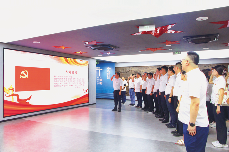 7月10日上午,中铁北京局五公司党委组织党员干部赴杭州市拱墅区公职人员警示教育基地开展主题警示教育活动,以案为鉴,进一步增强党员干部廉洁自律意识,坚定入党初心。图为重温入党誓词。 张兴淼 摄