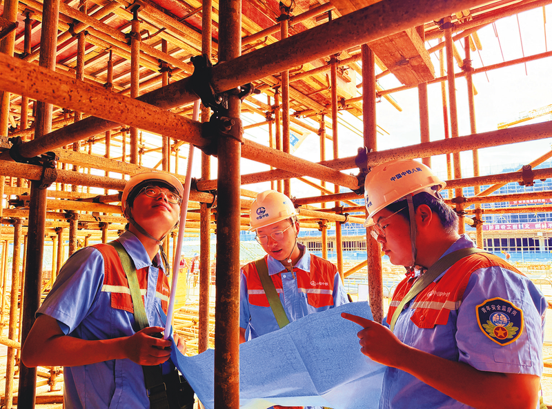 近日,中铁八局南充颐养健康谷项目部青安岗积极响应“质量月”活动要求,组织开展架管扣件搭设与临边防护专项质量检查活动,对脚手架扣件紧固力矩、杆件间距、连墙件设置以及各类临边、洞口防护的合规性与牢固性进行逐一排查,并就发现的风险点与现场作业人员即时沟通,督促整改。 杨学儒 摄