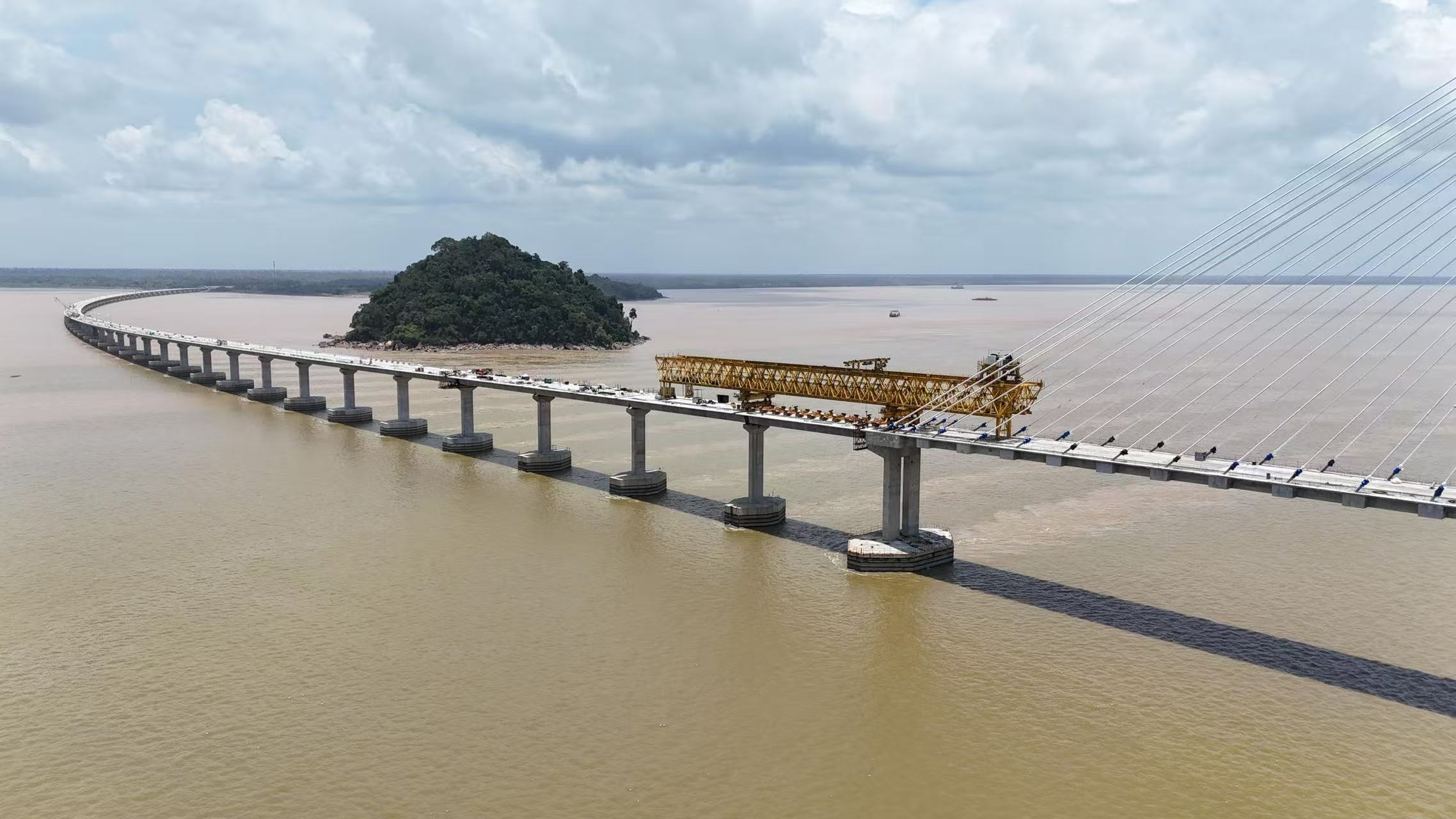 鲁巴跨海大桥位于类似“漏斗形”的河口海域,潮差大、流速快、浪涌强,施工组织难度大、技术水平要求高。面对复杂海况,项目团队利用登陆艇运输节段梁,并通过抛锚确保取梁过程安全稳定。针对连续梁体系转换作业,创新应用无落地支架的体系转换方法,设计专用整体性封闭施工平台,可沿纵桥向移动重复使用,无需拆解和再拼装,提高了施工效率、降低了施工成本、保障了施工安全。