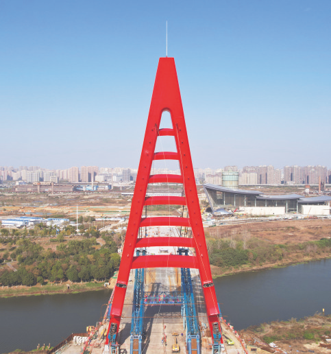 龙岗路跨南淝河特大桥全长931米,主桥为(170+90)米独塔不对称斜拉桥,塔、梁均为钢-砼混合结构。主跨钢箱梁采用步履式顶推法施工;主塔采用竖向转体法施工,竖转65度,历时16小时。 (王恒 孙华平 胡浩 摄影报道)